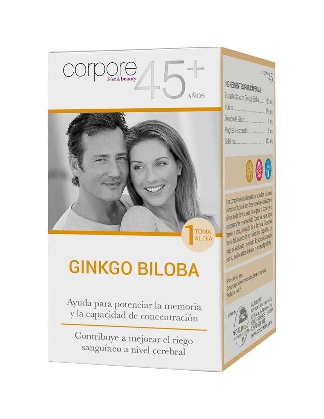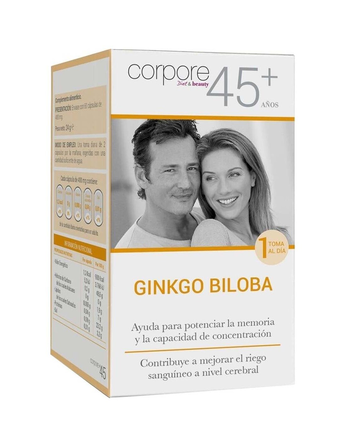 Corpore+45 Ginkgo Biloba 60caps es un complemento alimenticio a base de Ginkgo Biloba, un árbol con muchos fines terapéuticos que ayudan a aumentar la circulación sanguínea central y periférica y a la irrigación de los tejidos orgánicos. Además, también potencia la concentración y ayuda a tratar trastornos de memoria, dolor de cabeza y cambios de humor.