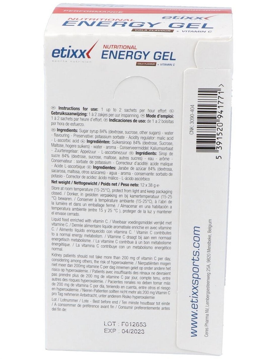 Etixx Nutritional energy Gel Cola es un gel a base de jarabe de azúcar """"triple acción"""". La combinación de monosocáridos, disacáridos y polisácaridos, hace que este gel tenga efectos inmediatos y proporcione energía de larga duración. Este es el gel energético más básico en el rango Etixx.