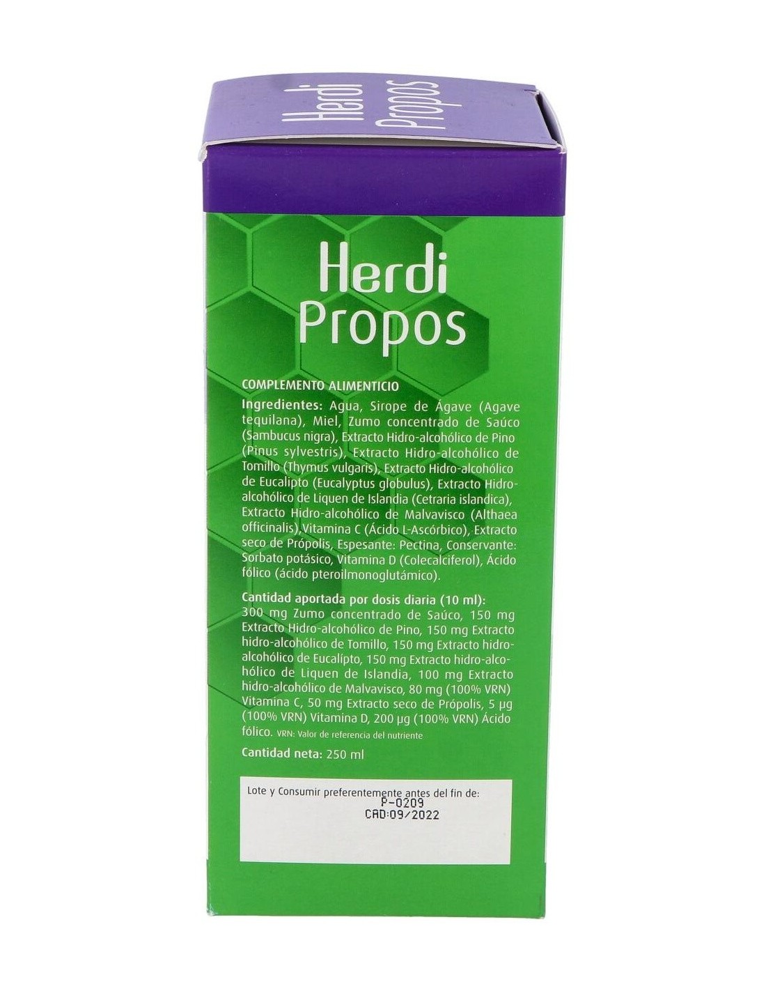 Fructosa, Agua, Extracto Hidro-alcohólico de Pino (Pinus sylvestris), Extracto Hidro alcohólico de Tomillo (Thymus vulgaris), Extracto Hidro-alcohólico de Eucalipto (Eucalyptus globulus), Extracto Hidro-alcohólico de Liquen de Islandia (Cetraria islandica), Extracto Hidro-alcohólico de Malvavisco (Althaea officinalis), Vitamina C (Ácido L-Ascórbico), Extracto seco de Própolis, Espesante: Pectina, Conservante: Sorbato potasio.