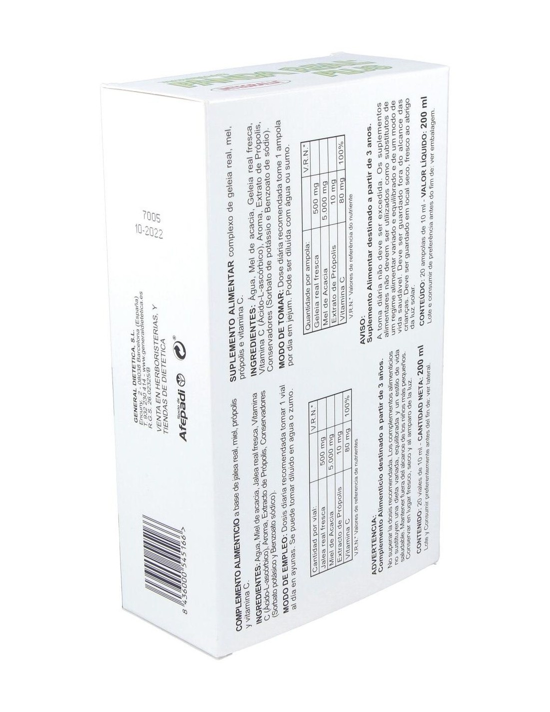 Jalea Real fresca 400 mg, Vitamina C 12 mg ( 15% C.D.R.), Lecitina de soja 10 mg, Extracto de Própolis 5 mg.