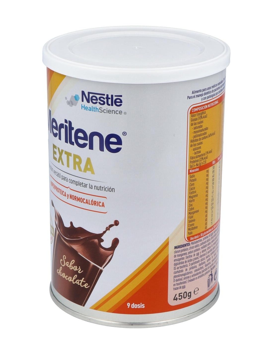 Maltodextrinas, proteínas de leche, sacarosa, leche entera, leche desnatada, cacao magro, minerales (citrato potásico, cloruro potásico, citrato sódico, carbonato cálcico, cloruro sódico, pirofosfato férrico, sulfato de zinc, fosfato cálcico, gluconato cúprico, sulfato de manganeso, yoduro potásico, molibdato sódico, selenito sódico, cloruro de cromo y fluoruro sódico), aceites vegetales (nabina y girasol), emulgentes (lecitina de soja y ésteres cítricos de monoglicéridos y diglicéridos de ácidos grasos), vitaminas (L-ascorbato sódico, acetato de DL-alfa- tocoferilo, D pantotenato cálcico, niacina, clorhidrato de tiamina, clorhidrato de piridoxina, riboflavina, acetao de retinilo, ácido pteroilmonoglutámico, colecalciferol, filoquinona, cianocobalamina y D-biotina), aromas y antioxidantes (palmitato de ascobilo y extracto rico en tocoferoles).