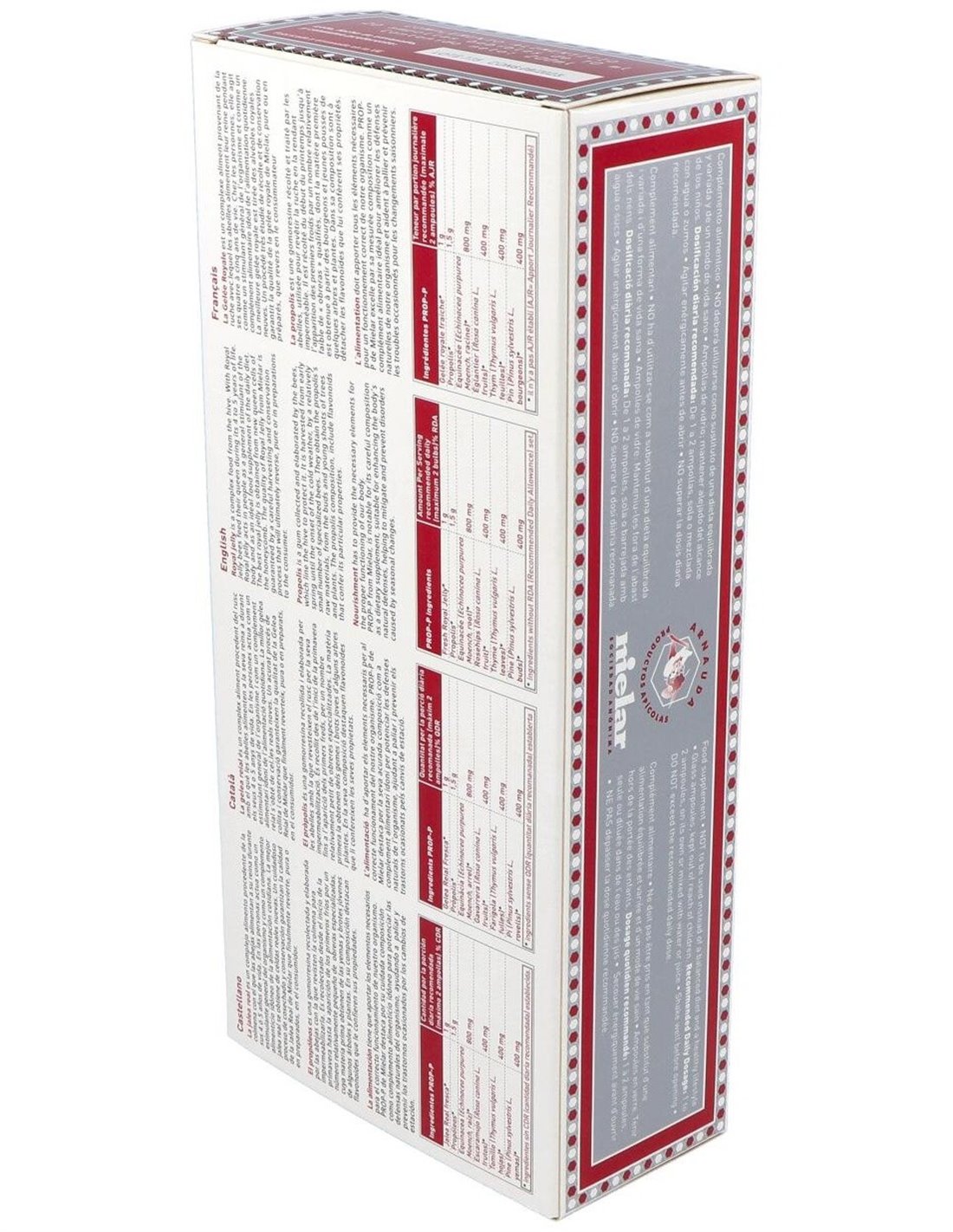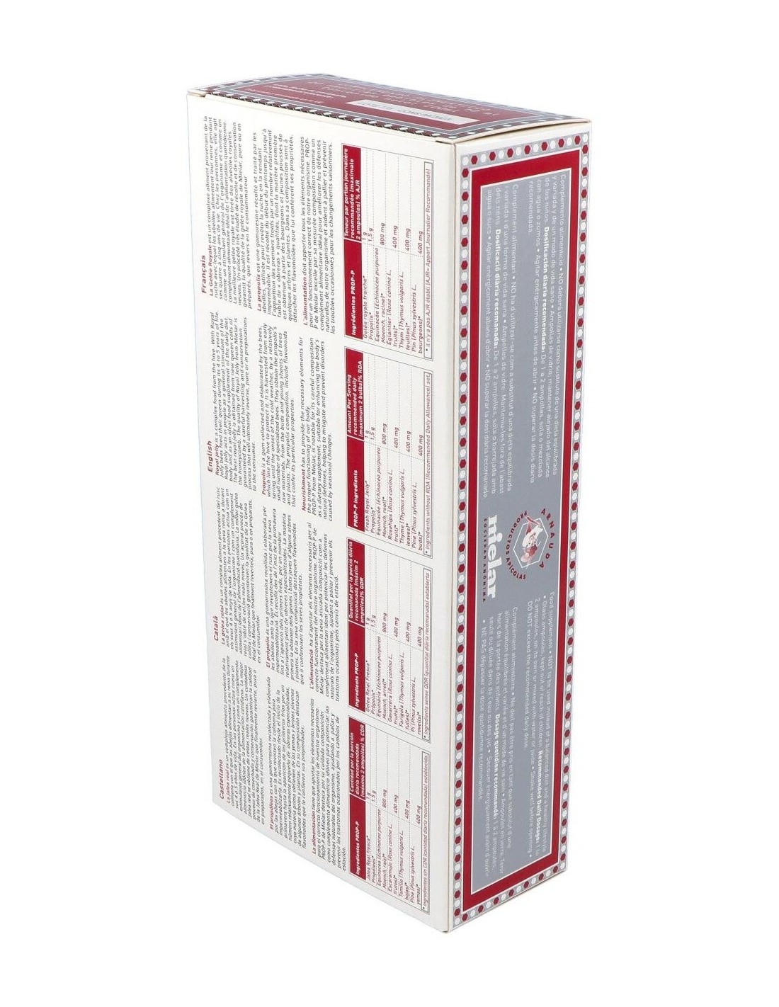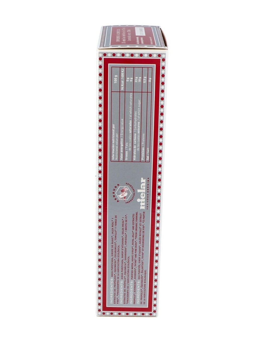 Agua purificada, fructosa*, jalea real* y extractos de : propóleos*, equinácea*, escaramujo*, tomillo* y yemas de pino*.