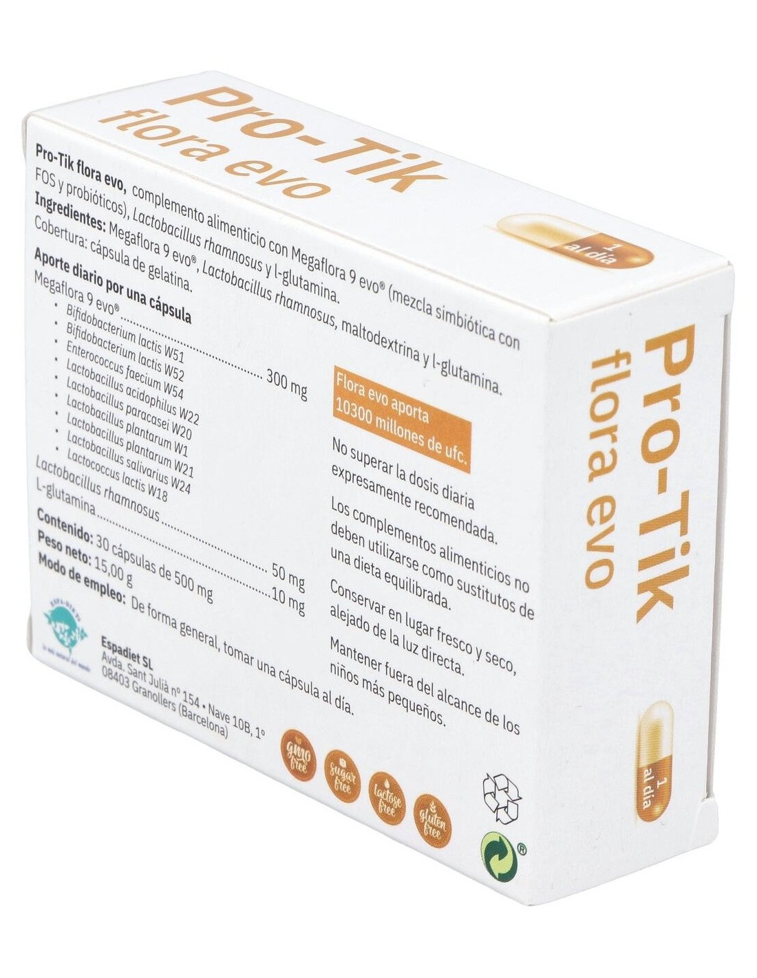 Megaflora 9 evo®, Lactobacillus rhamnosus, maltodextrina y l-glutamina. Cobertura: cápsula de gelatina.