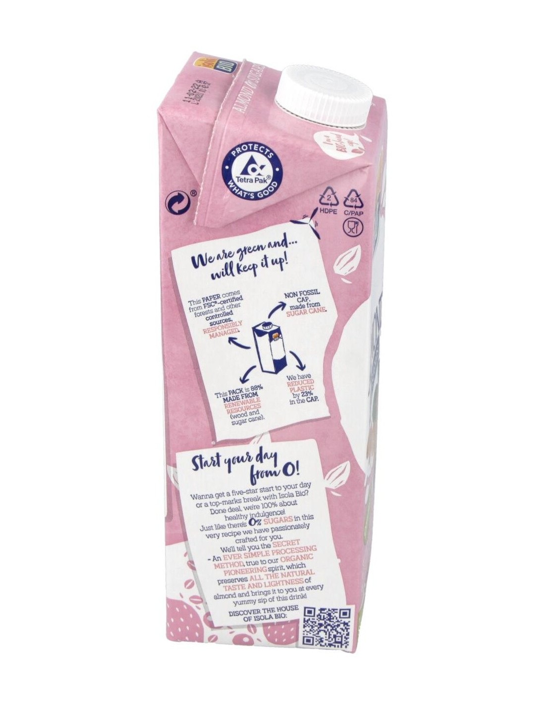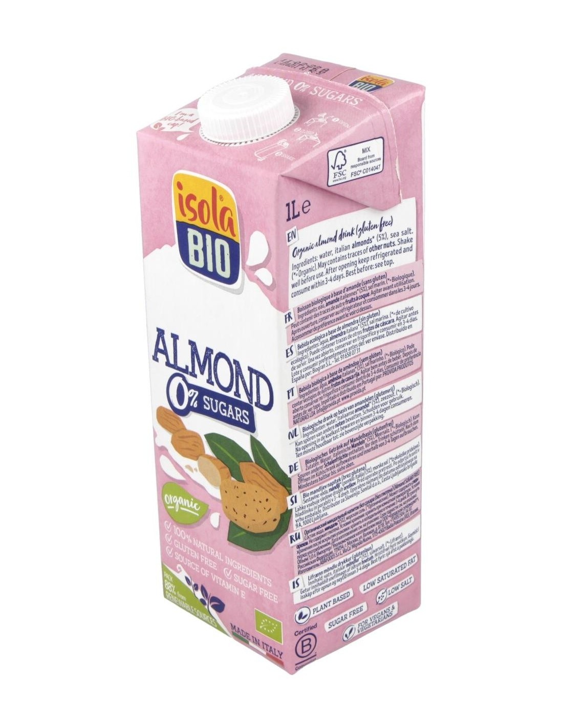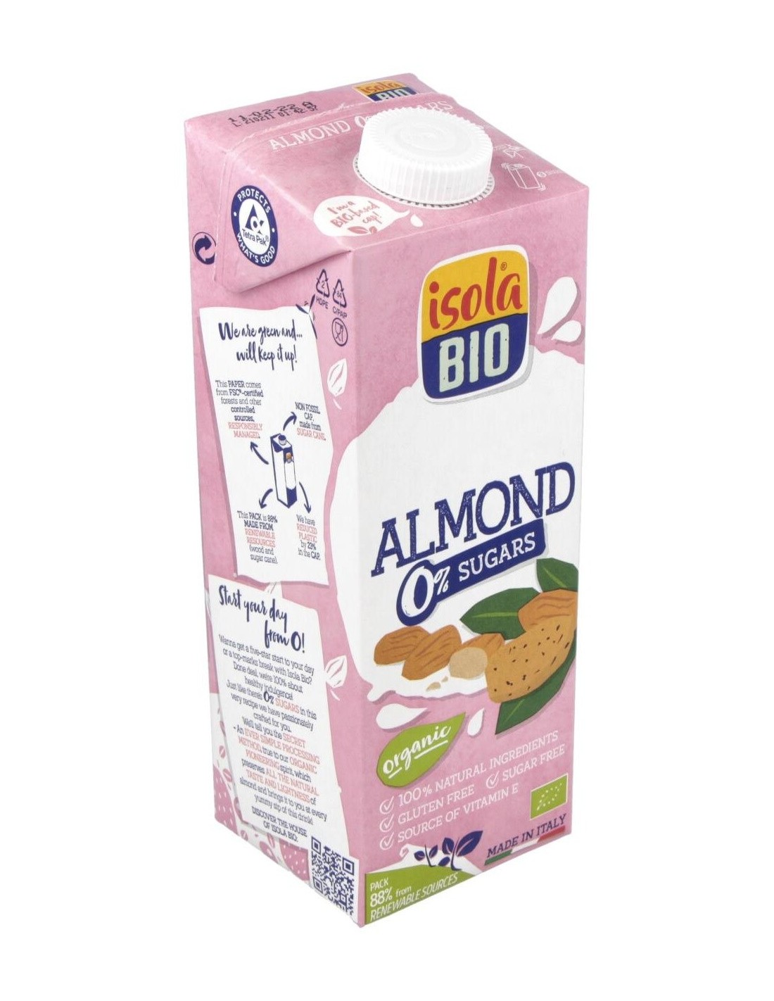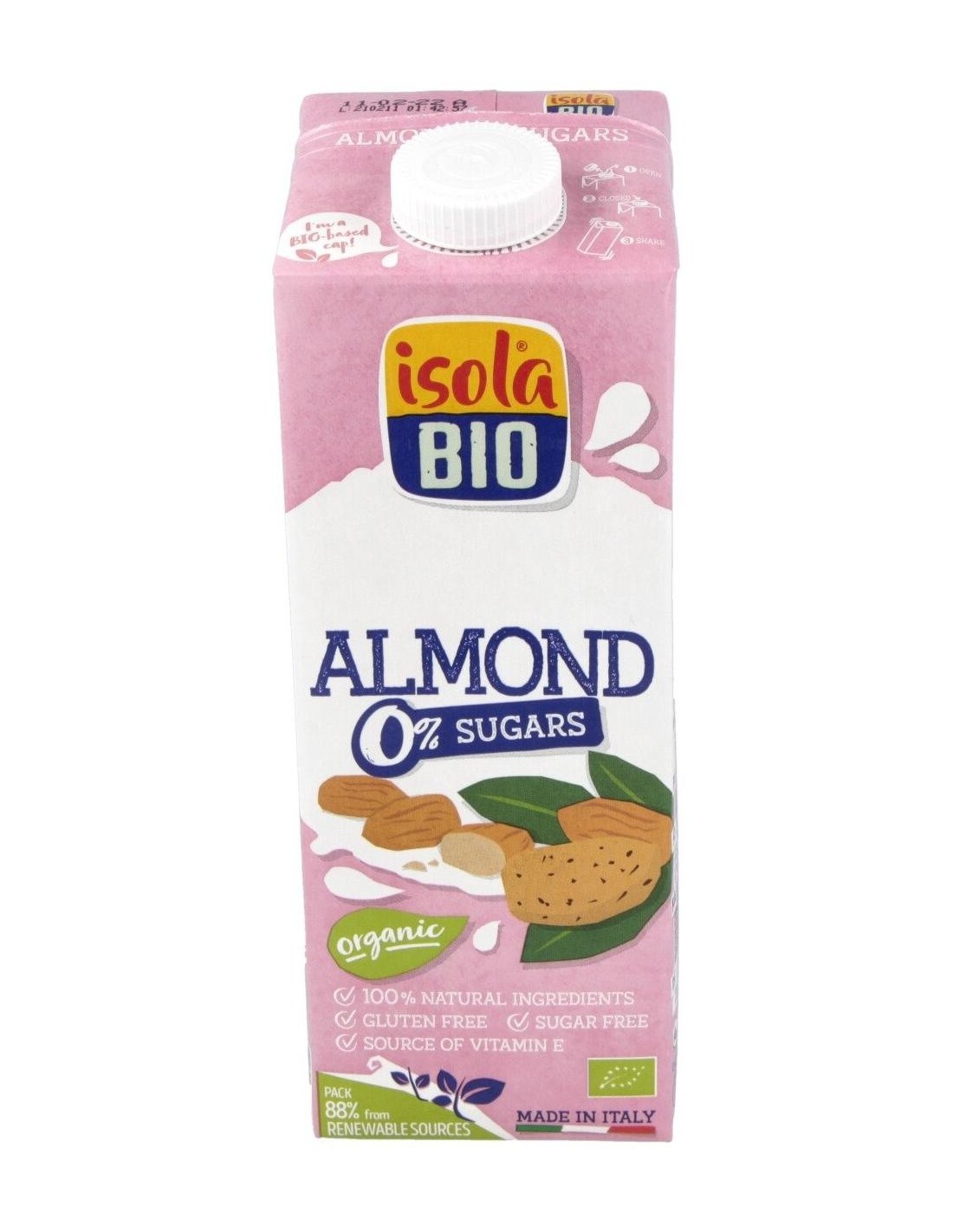 Bebida de Almendra 0 % Azúcares 1L de ISOLA BIO es un tipo de leche de almendras que está fabricada 100 % con ingredientes naturales. Es baja en sal, en azúcar y en grasas saturadas. Es una fuente de calcio que pueden utilizar personas que lleven a cabo la dieta Kosher y es apta para veganos. No contiene aceite de palma ni colorantes, colorantes, gluten. Se puede beber en frío y en caliente así como mezclar con otros ingredientes como cacao en polvo café o cereales. Este producto es ideal para todas aquellas personas que son intolerantes a la lactosa o que siguen dieta. Hasta el momento, no ha tenido contraindicaciones. Puede contener trazas de soja y frutos de cáscara por lo que conviene también mirar los ingredientes para evitar reacciones alérgicas.