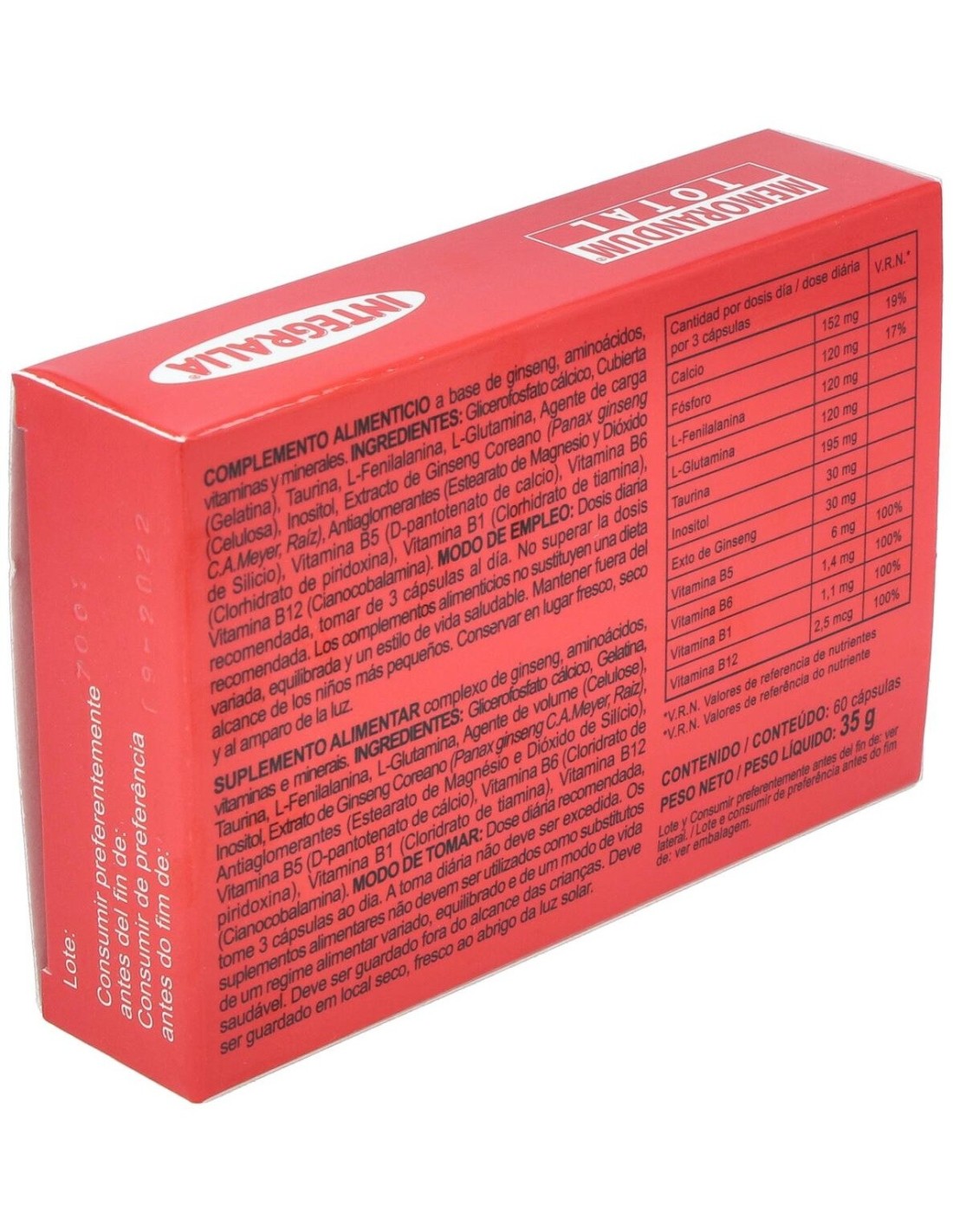 Cápsulas para la mejora del sistema cognitivo. Integralia Memorandum es un producto que contiene 60 cápsulas en el empaque. Promueve la concentración y el correcto funcionamiento de las habilidades intelectuales. Fomenta la memoria a largo y corto plazo. Funciona como una herramienta para la realización de tareas bajo presión. Aumenta la actividad cerebral con relación a las tareas específicas de larga duración. Ayuda a la toma de decisiones de forma rápida. Está recomendado para personas en entornos de trabajo exigentes. Se sugiere su uso a personas con problemas de concentración o desórdenes de déficit de atención. Útil para estudiantes universitarios. No apto para el manejo de niños y no debe ser consumido por infantes. No se recomienda su uso a personas bajo tratamiento psicoterapéutico. En caso de presentar reacciones adversas a las esperadas, consultar con el médico de inmediato.
