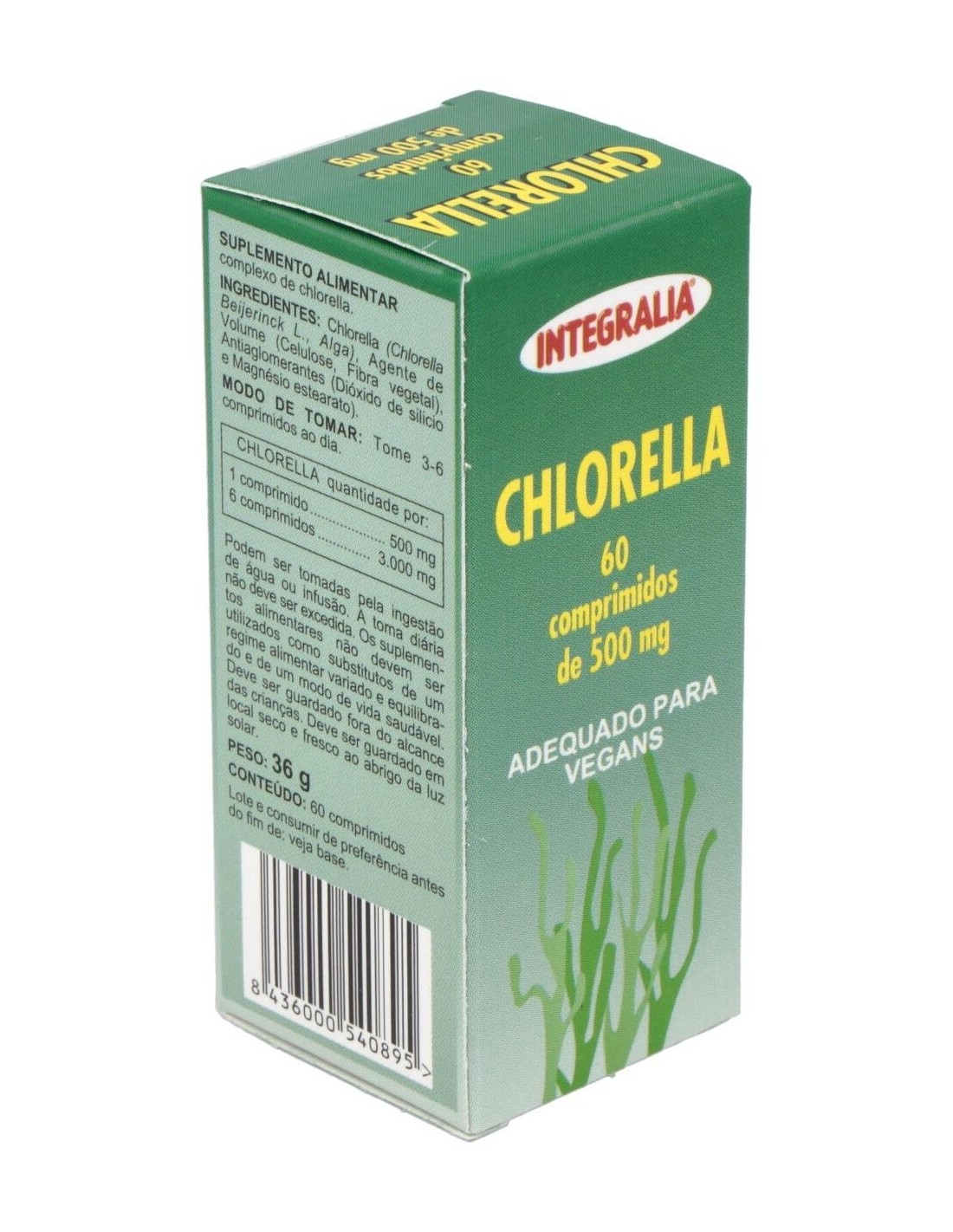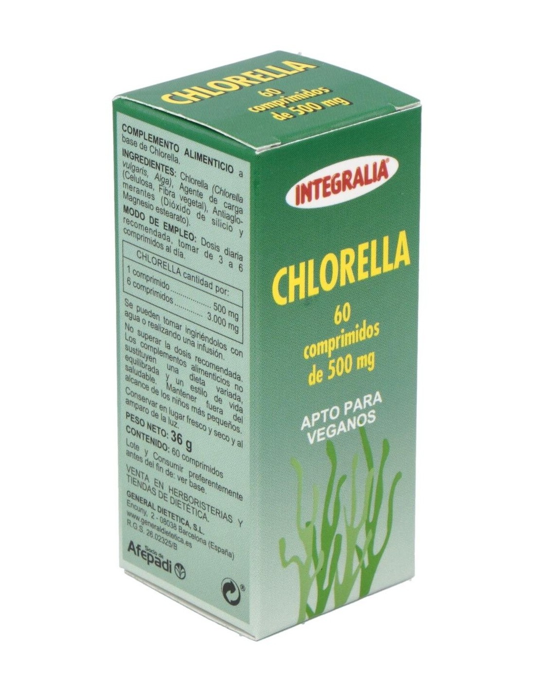 Es un complemento alimenticio que aporta nutrientes en forma de vitaminas, especialmente la B12, proteínas y minerales. Su ingrediente principal es la chlorella, una microalga con un alto contenido en clorofila que ejerce funciones depurativas y antioxidantes en el organismo al ser ingerida. Esta alga ayuda a estimular el sistema inmunitario y posee propiedades analgésicas y antiinflamatorias. Es rica en betacaroteno y la dosis recomendada satisface las necesidades diarias de provitamina A, así como de hierro y zinc. En menor cantidad, también aporta magnesio y fósforo. Integralia recomienda estos comprimidos a todas las personas que deseen complementar su dieta y eliminar del organismo metales pesados, herbicidas, toxinas, etc. Ayudan a protegen ante ciertas infecciones bacterianas y virales. Este complemento no sustituye una dieta sana y variada y debe mantenerse alejado de los niños pequeños.