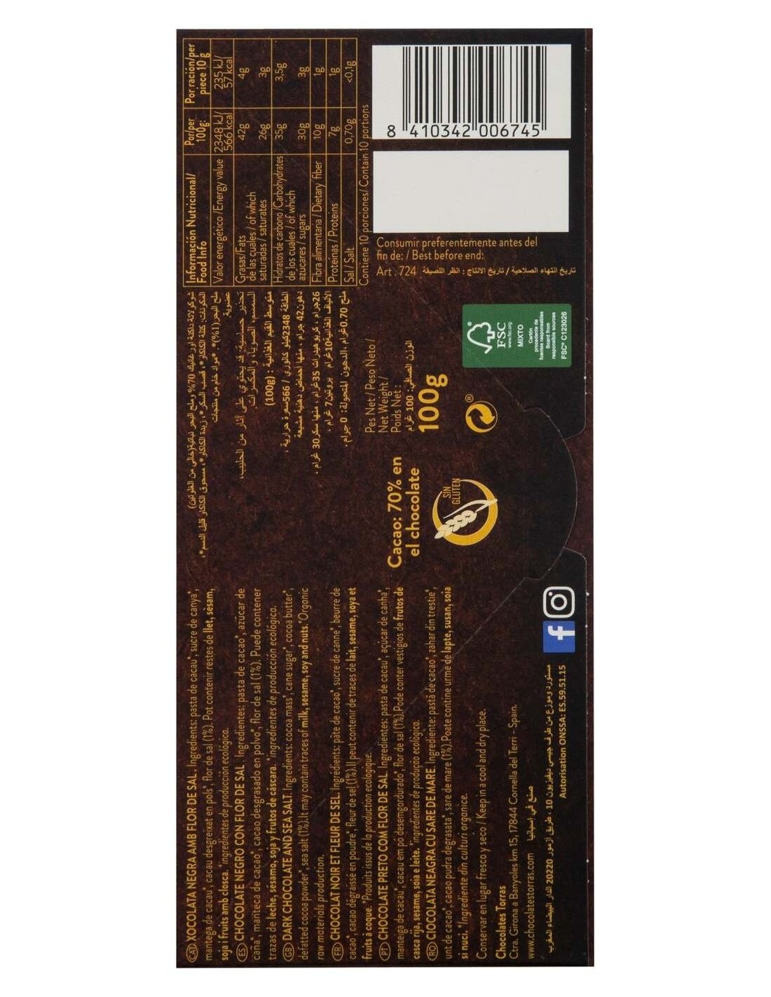 Chocolate Negro 70% Con Flor De Sal 100G Bio Sg de Torras
