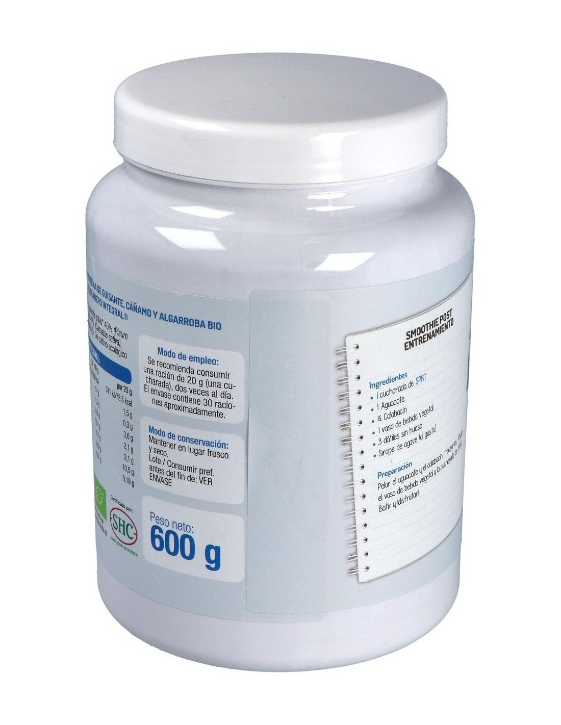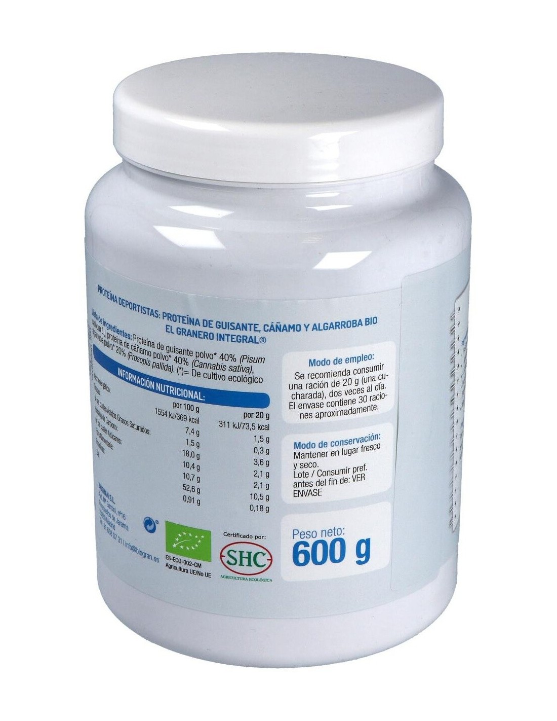 Proteína de guisante polvo* (Pisum sativum L.), proteína de cáñamo polvo* 40% (Cannabis sativa), algarroba polvo 20% (Prosopis pallida).
