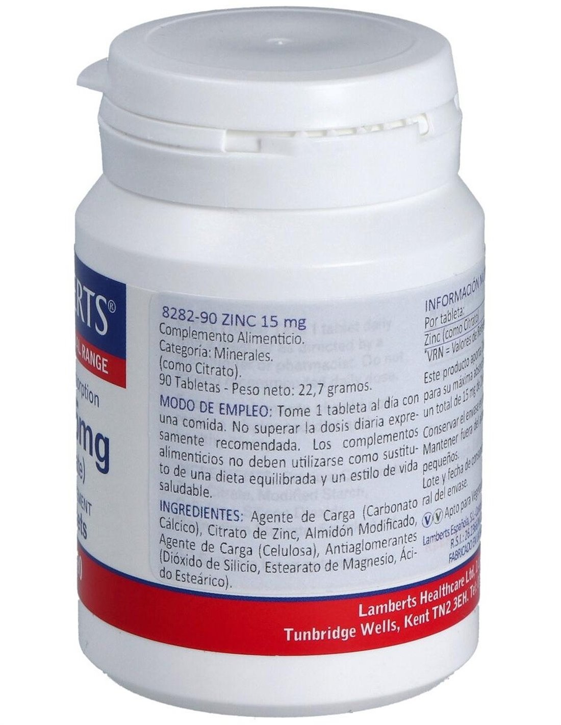 agente de carga (carbonato cálcico), citrato de zinc, almidón modificado, agente de carga (celulosa), anti aglomerantes (dióxido de silicio, estearato de magnesio, ácido esteárico).