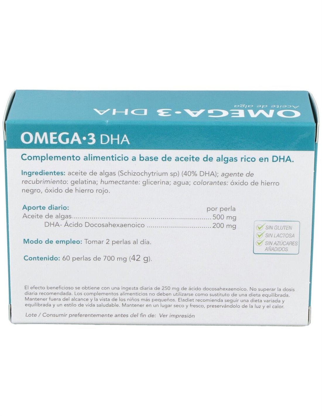 Por 2 comprimidos: Aceite de algas (500 mg), DHA (Ácido Docosahexaenoico) (200 mg).