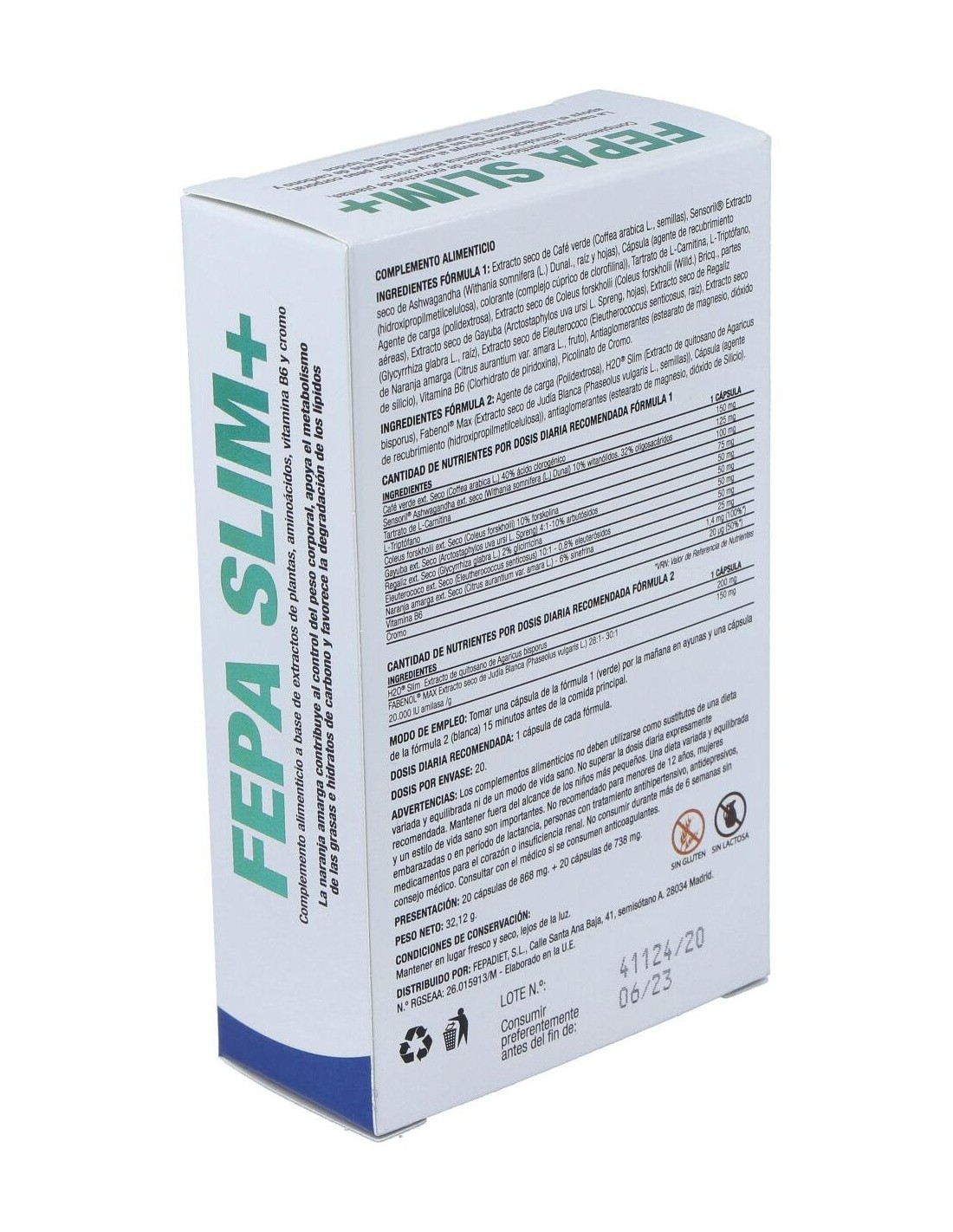 Fórmula 1: Extracto seco de Café verde (Coffea arabica L., semillas), Sensoril® Extracto seco de Ashwagandha (Withania somnifera (L.) Dunal., raíz y hojas), Cápsula (agente de recubrimiento (hidroxipropilmetilcelulosa), colorante (complejo cúprico de clorofilina)), Tartrato de L-Carnitina, L-Triptófano, Agente de carga (polidextrosa), Extracto seco de Coleus forskholii (Coleus forskholii (Willd.) Bricq., partes aéreas), Extracto seco de Gayuba (Arctostaphylos uva ursi L. Spreng, hojas), Extracto seco de Regaliz (Glycyrrhiza glabra L., raíz), Extracto seco de Eleuterococo (Eleutherococcus senticosus, raiz), Extracto seco de Naranja amarga (Citrus aurantium var. amara L., fruto), Antiaglomerantes (estearato de magnesio, dióxido de silicio), Vitamina B6 (Clorhidrato de piridoxina), Picolinato de Cromo.
