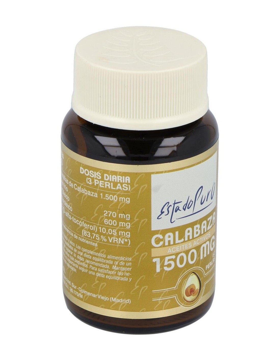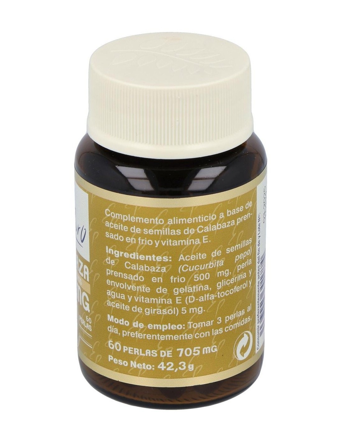 Aceite de semillas de Calabaza (Cucurbita pepo) prensado en frío 500 mg, perla envolvente de gelatina, glicerina y agua y vitamina E (D-alfa-tocoferol y aceite de girasol) 5 mg