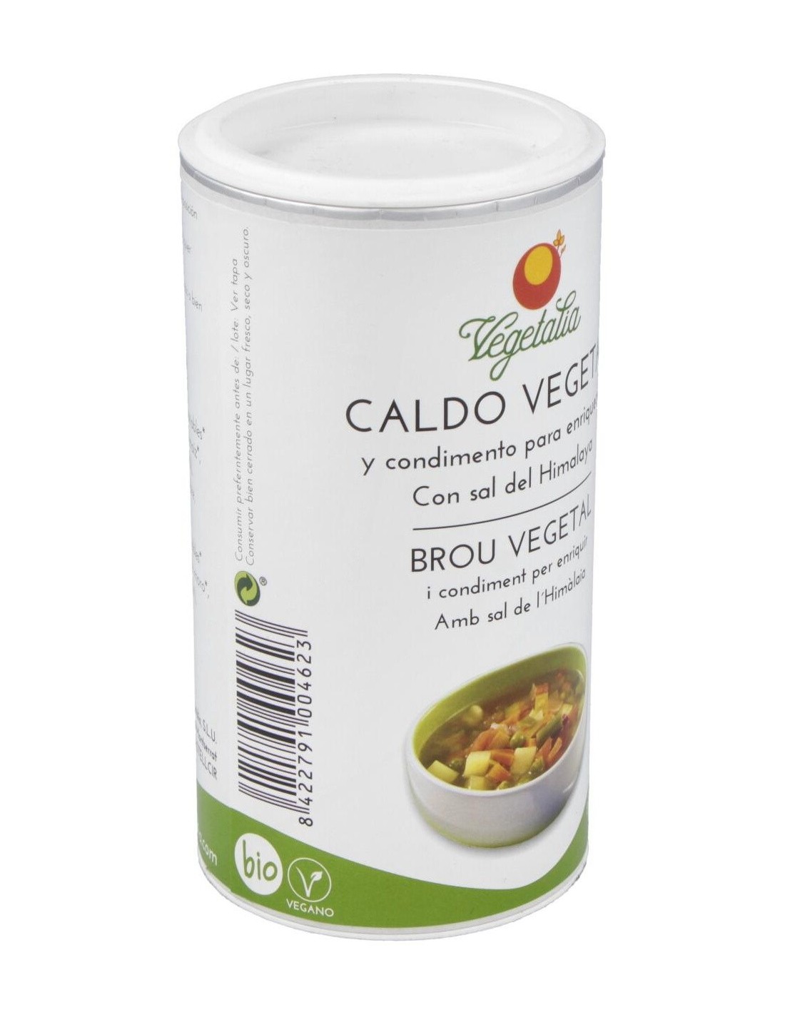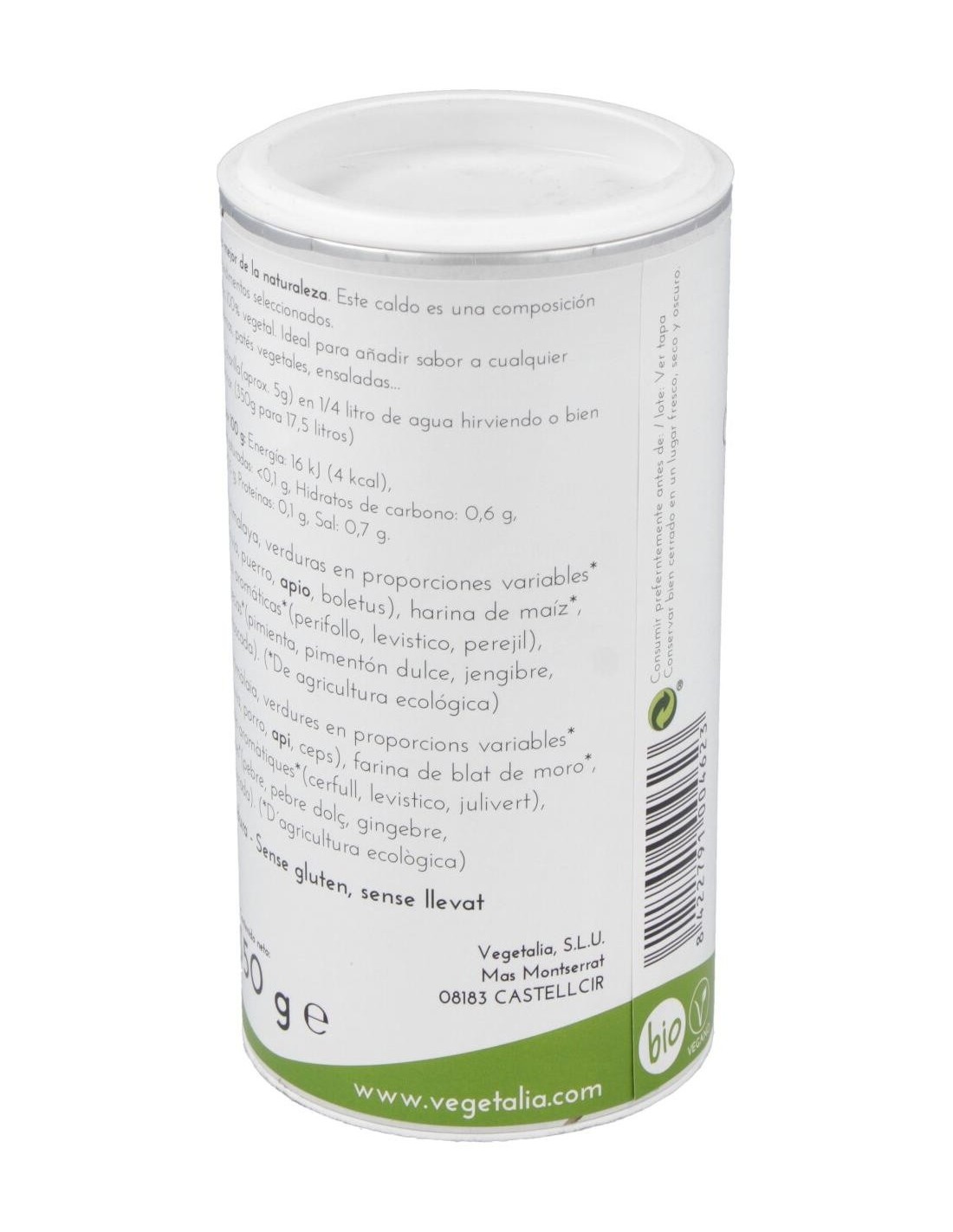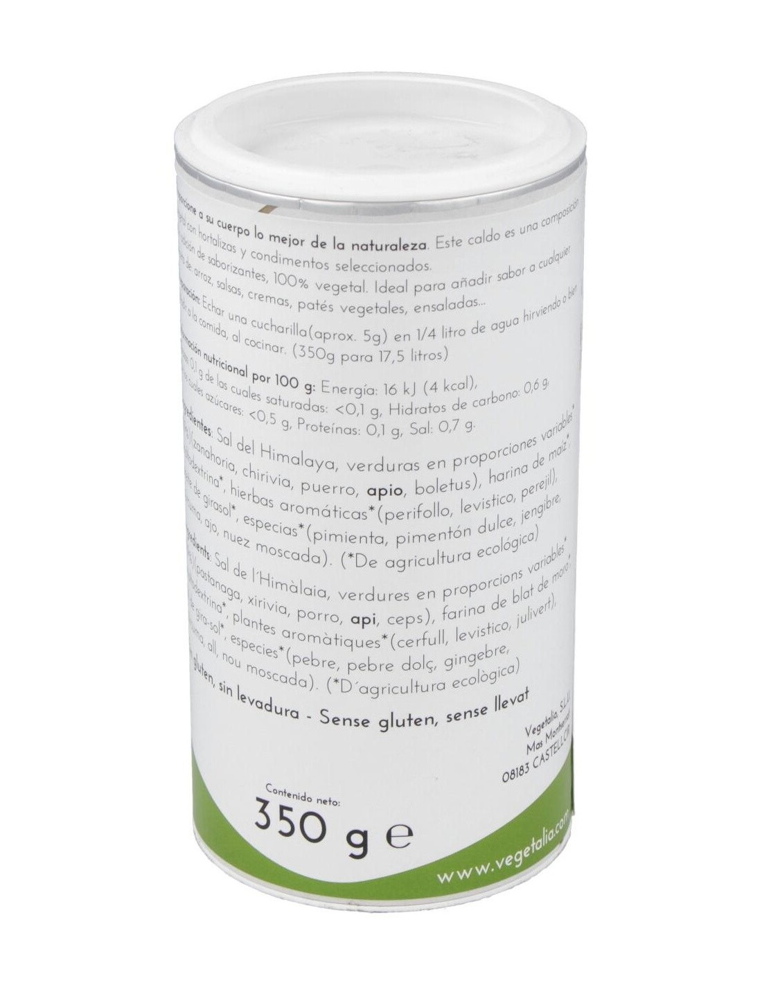 Sal del Himalaya, hortalizas* (19%) (zanahoria, chirivía, cebolla, puerro, azafrán, setas), harina de maíz*, maltodextrina*, hierbas* (perifollo, apio, perejil), aceite de girasol* y especies* (pimienta, pimentón, jengibre, cúrcuma, ajo y nuez moscada)