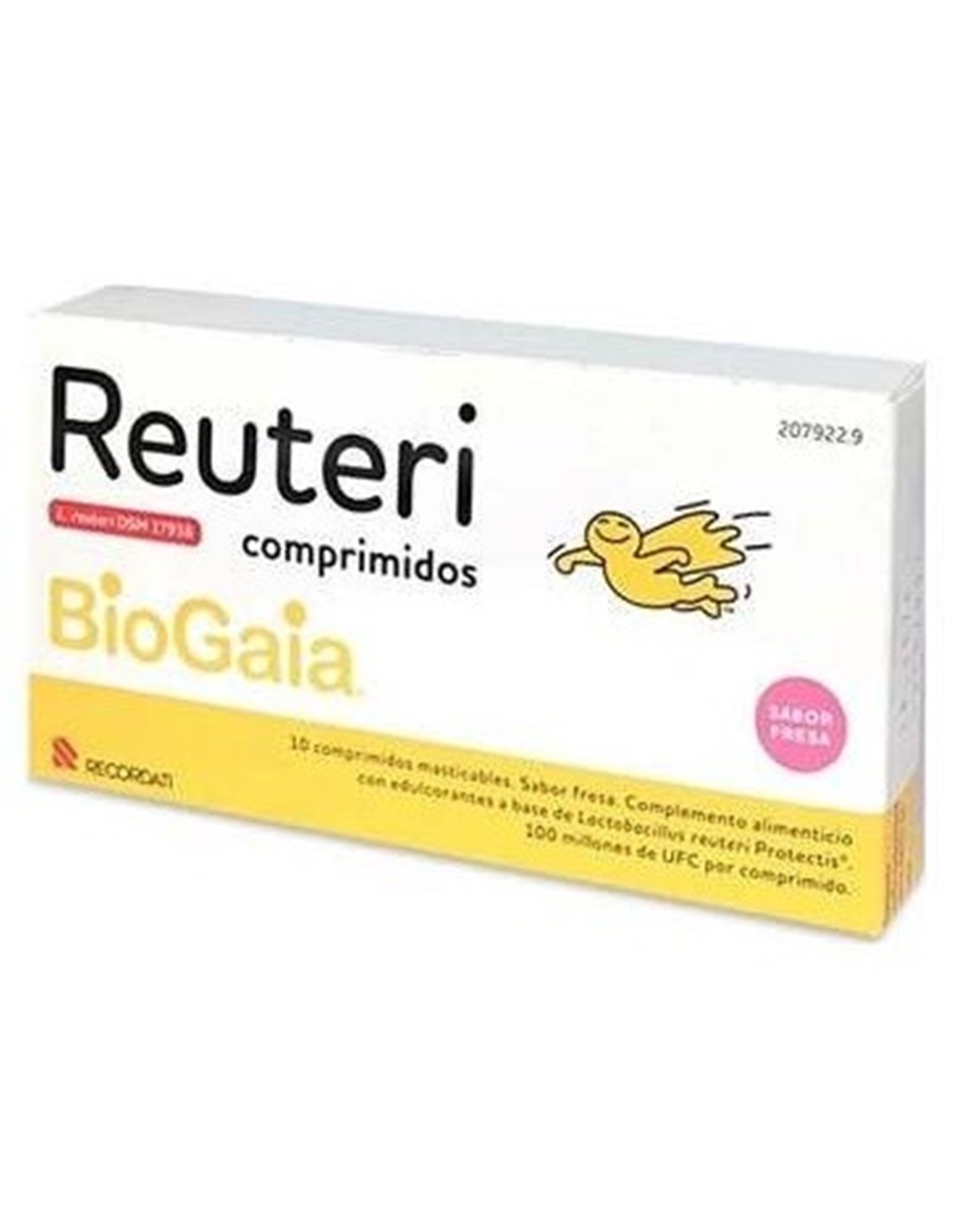 Incrementador de volumen: isomaltosa (E-953), edulcorante: xilitol (E-967), Lactobacillus reuteri Protectis® DSM 17938, aroma de fresa, acidulante: ácido cítrico.\ \ *100 millones de UFC por comprimido.