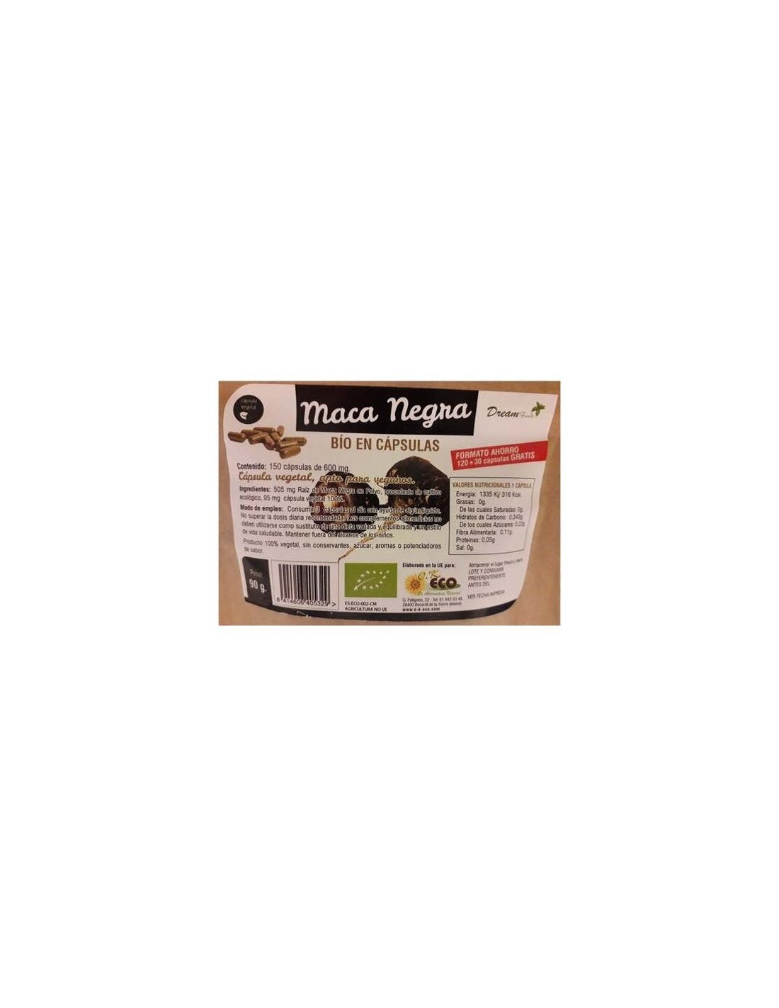 Maca negra en polvo procedente de la agricultura Ecológica y agente de recubrimiento (hidroxipropilmetilcelulosa).