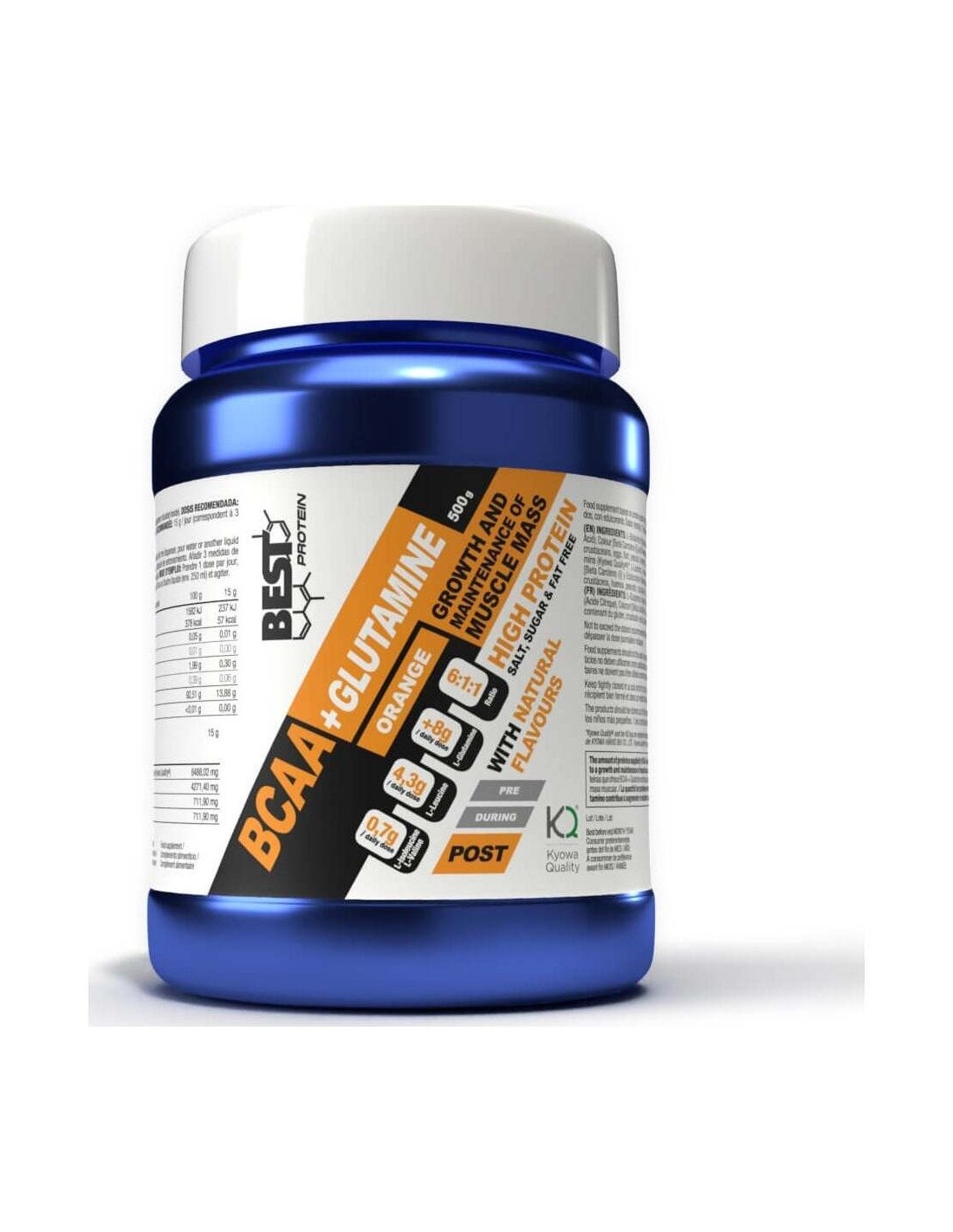 NARANJA L-GLUTAMINA KYOWAQUALITY®, L-LEUCINA, NARANJA EN POLVO DESHIDRATADA (11,27%), L-ISOLEUCINA, L-VALINA, L-LISINA, ACIDULANTE(ACIDO CÍTRICO), AROMA NATURAL, EDULCORANTE(S) E955, AROMA, COLORANTE (BETA CAROTENO E-160A).