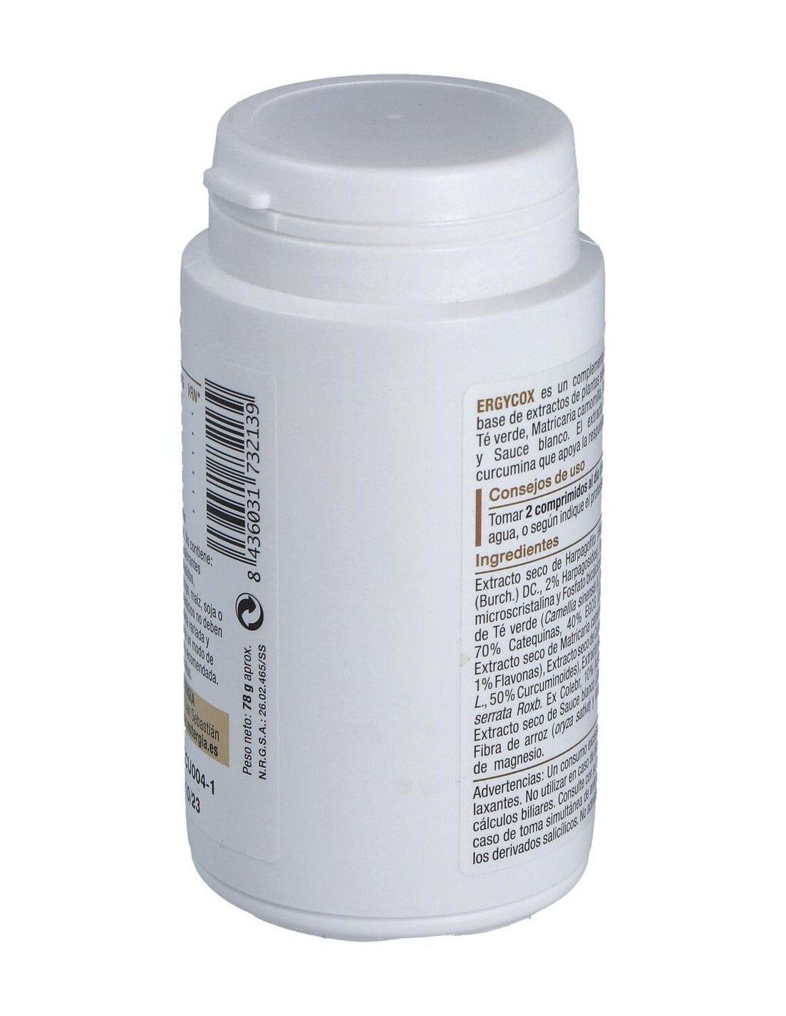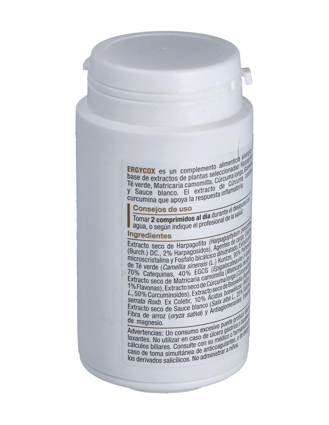 Extracto seco de Harpagofito (Harpagophytum procumbens (Burch.) DC., 2% Harpagosidos), celulosa microscristalina y fosfato bicálcico dihidratado, extracto seco de Té verde (Camellia sinensis (L.) Kuntze, 95% polifenoles, 70% catequinas, 40% EGCG (Epigalocatequina-3-Galato), extracto seco de Matricaria camomilla (Matricaria recutita L., 1% flavonas), extracto seco de Cúrcuma longa (Curcuma longa L., 50% curcuminoides), extracto seco de Boswellia (Boswellia serrata Roxb. Ex Colebr, 10% ácidos boswélicos) y extracto seco de Sauce blanco (Salix alba L., 25% Salicina), estearato de magnesio y dióxido de silicio.