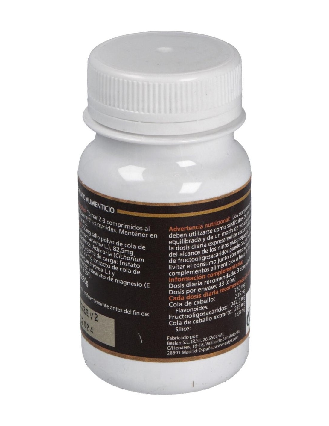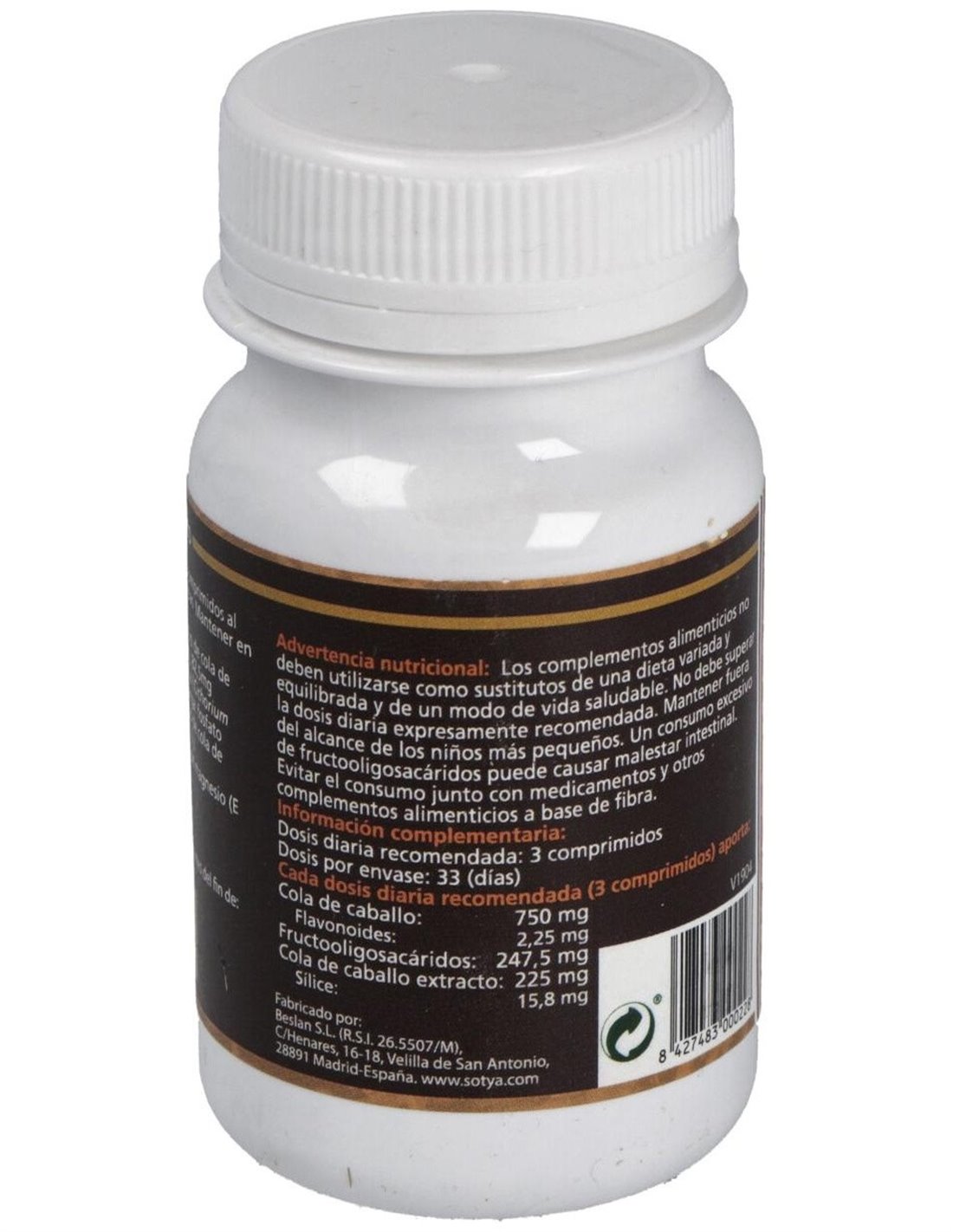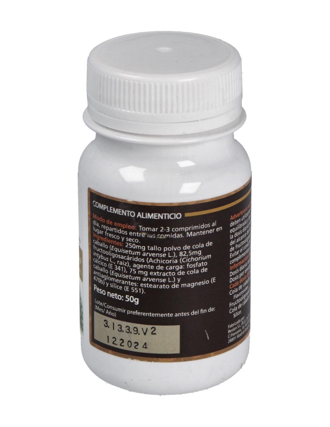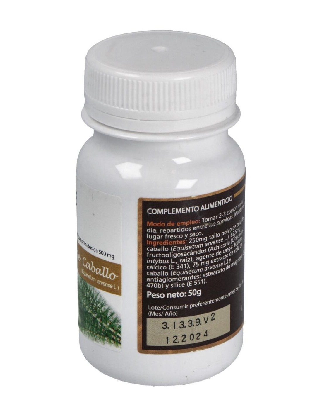 100 comprimidos de 500mg, con 250mg de planta de cola de caballo (Equisetum arvense), 75mg de extracto estandarizado con un 7% sílice y excipientes.