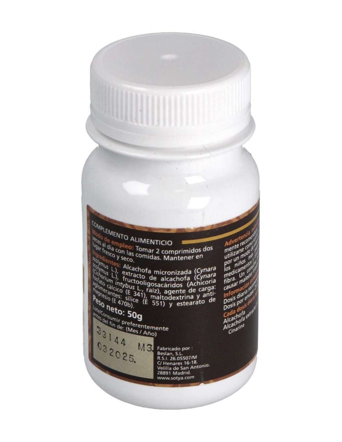 190 mg alcachofa micronizada, 100 mg extracto de alcachofa, maltodextrina, 83 mg fibra de achicoria (raíz), fosfato cálcico E341, sílice E551, estearato de magnesio E470b.