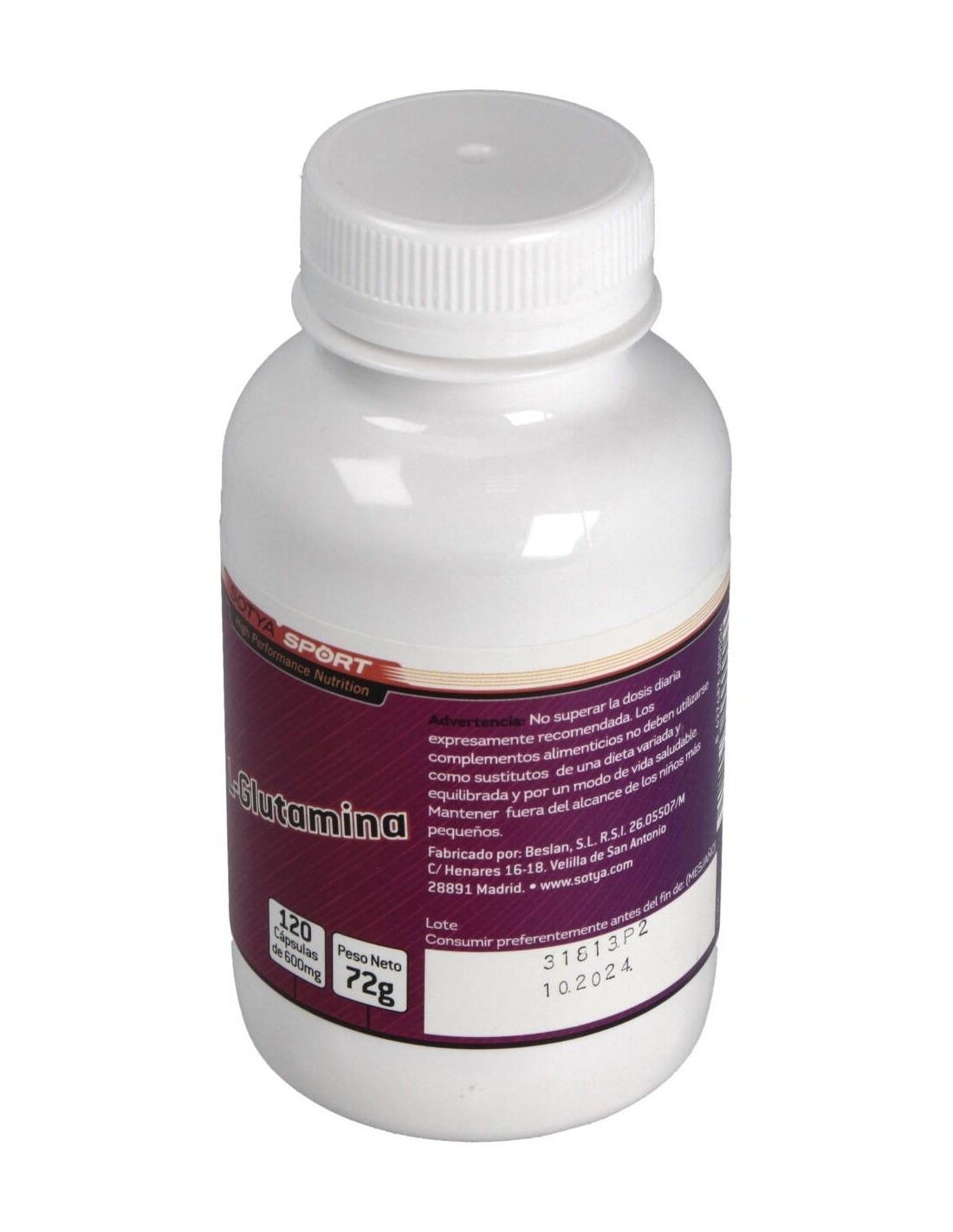 Sotya L-glutamina 600mg es un complemento alimenticio que te ayudará a reforzar y reparar las fibras musculares después de la práctica de deporte o de un ejercicio físico intenso. Ademas, neutralizará el exceso de ácido en los músculos, como el ácido láctico, responsable de la aparición de las molestas """"agujetas"""".