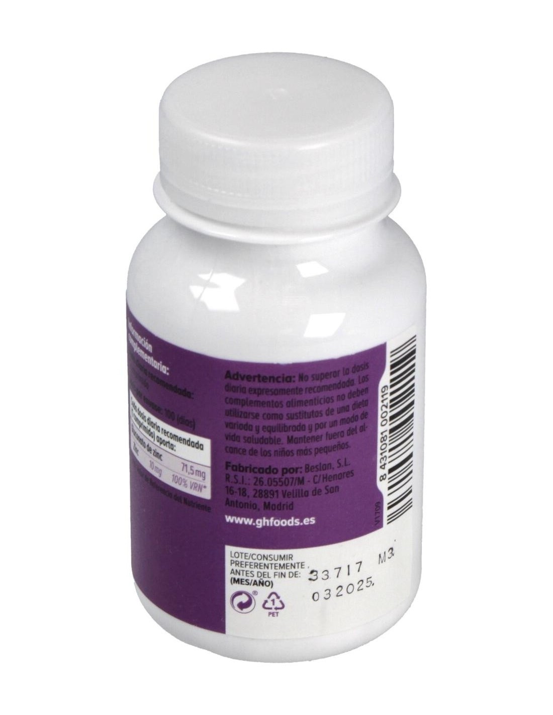 GHF Zinc 50% CDR 500mg es un complemento alimenticio que te ayudará a cuidar la piel, las uñas y el cabello, gracias a su acción antiedad y antioxidante.