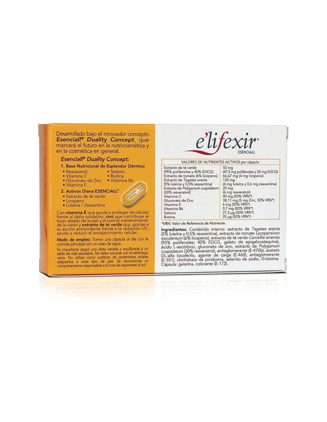 Extracto de Tagetes erecta (5% luteína y 0,5% zeaxantina), extracto de tomate (6% licopeno), extracto de té verde (95% polifenoles: 40% EGCG, galato de epigalocatequina), ácido L-ascórbico, gluconato de zinc, extracto de Polygonum cuspidatum (30% resveratrol), antiaglomerante (E-470b), acetato DL-alfa-tocoferilo, agente de carga (E-460), estabilizante (E-551), clorhidrato de piridoxina, selenito de sodio, D- biotina. Cápsula: gelatina, colorantes (E-171, E-172).