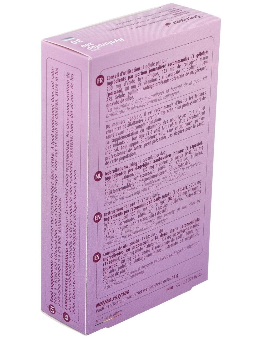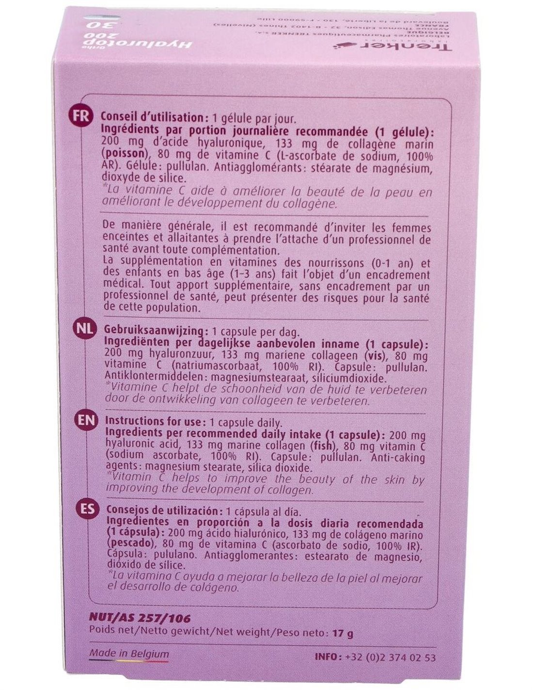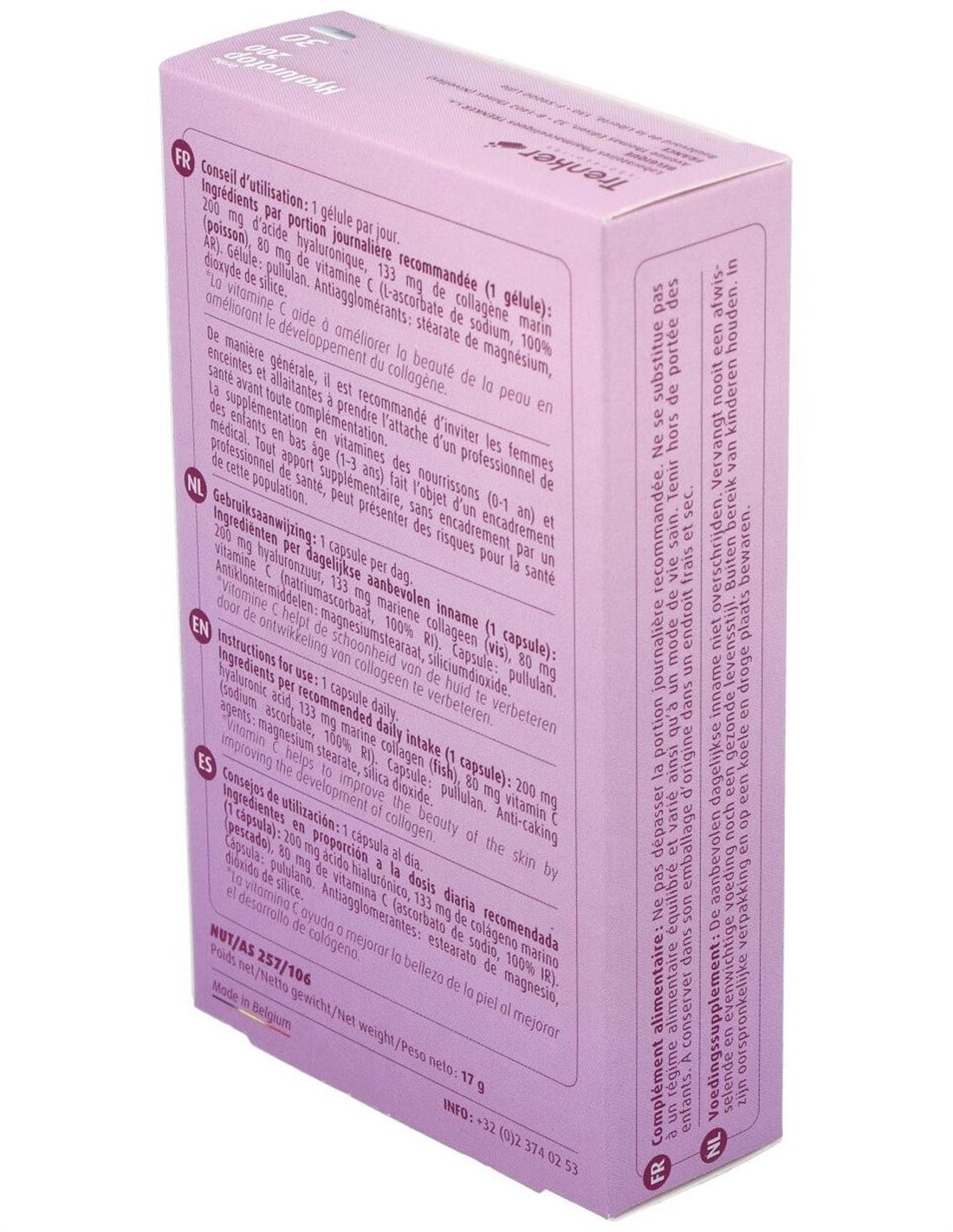Complemento alimenticio que ayuda a mejorar el aspecto de la piel. Contribuye a la formación normal de colágeno para garantizar el funcionamiento normal de la piel, a la protección de las células contra el estrés oxidativo provocado por los agentes contaminantes ambientales y la radiación solar. Elaborado con ácido hialurónico, colágeno marino, vitamina C entre otros.