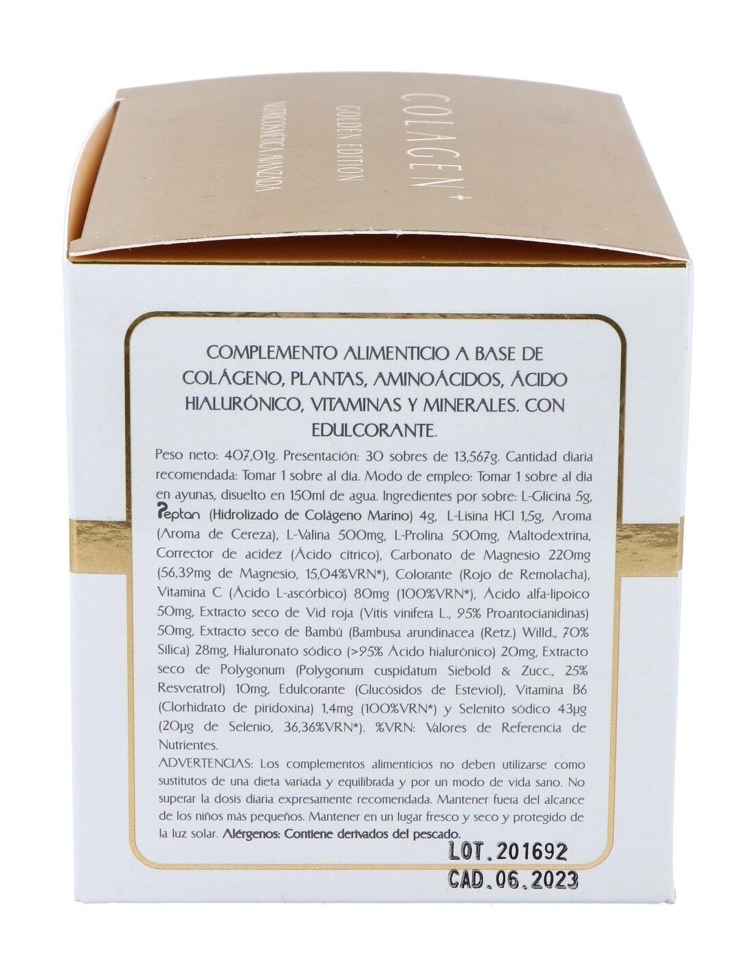 L-Glicina, Peptan (Hidrolizado de Colágeno Marino), L-Lisina HCI, Aroma de Cereza, L-Valina, L-Prolina, Maltodextrina, Corrector de acidez (Ácido cítrico), Carbonato de Magnesio, Colorante (Rojo de Remolacha), Vitamina C, Ácido alfa-lipoico, Extracto seco de Vid roja, Extracto seco de Bambú, Hialurato sódico, Extracto seco de Polygonum, Edulcorante, Vitamina B6 y Selenito sódico.