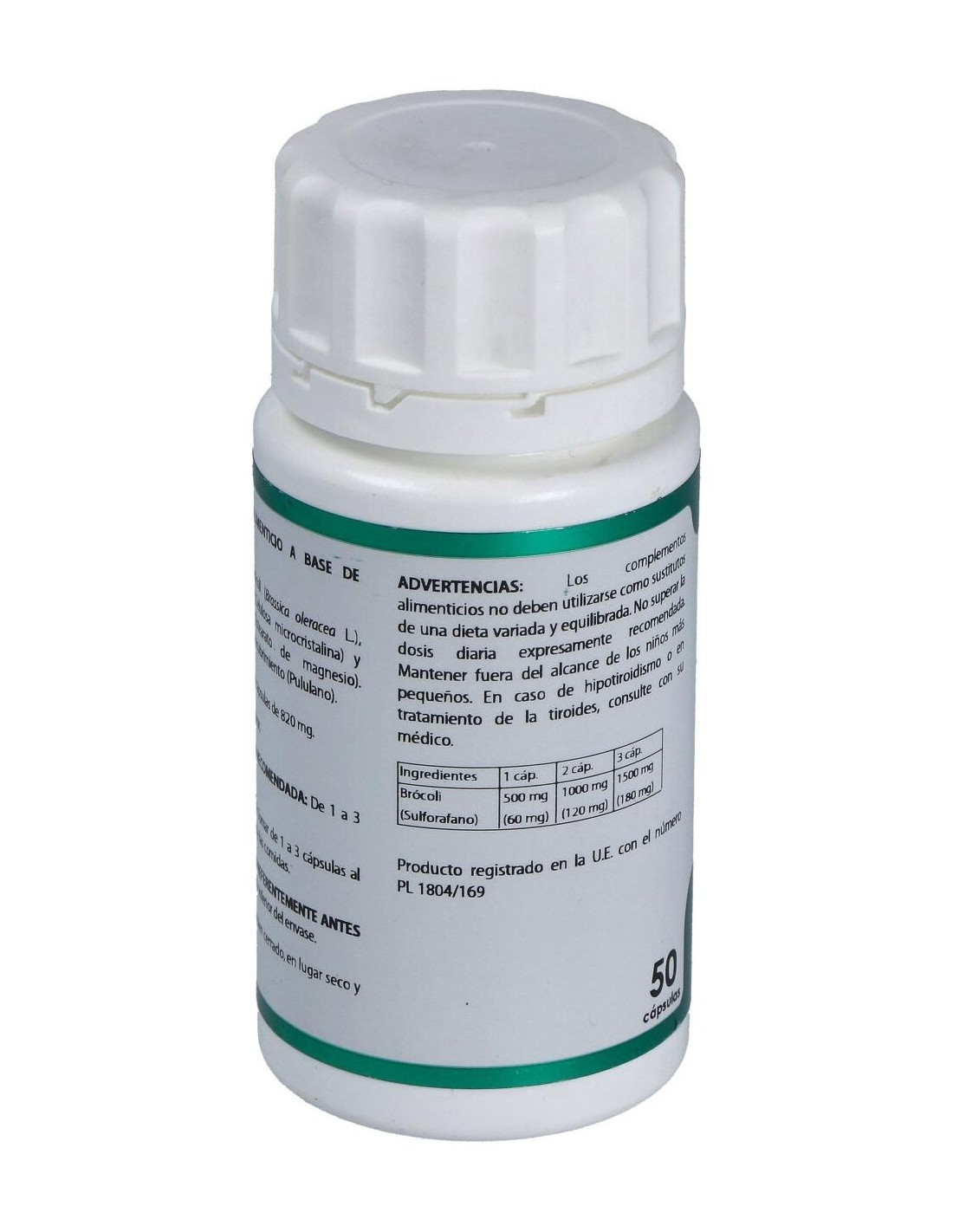 Brócoli extracto seco (Brassica oleracea L. var. italica), 500 mg. Envoltura: polisacárido de origen vegetal (pululano)