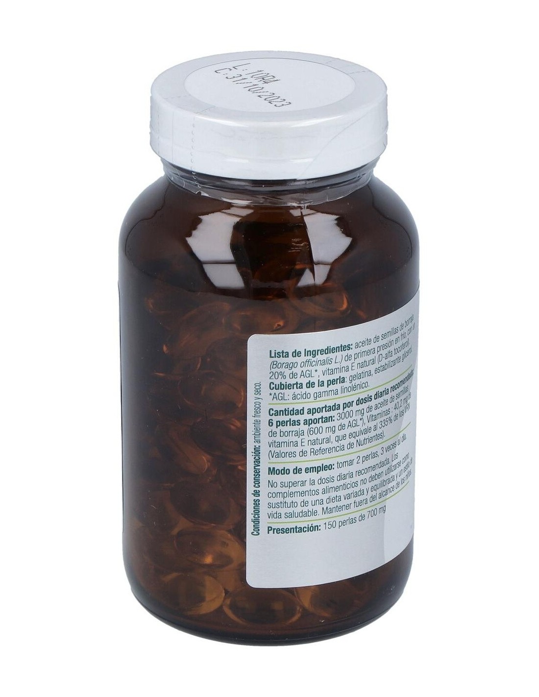 ACEITE DE SEMILLAS DE BORRAJA (BORAGO OFFICINALIS L.) DE PRIMERA PRESIÓN EN FRÍO, CON UN 20% DE AGL, VITAMINA E NATURAL (D-ALFA TOCOFEROL). CUBIERTA DE LA PERLA: GELATINA, ESTABILIZANTE GLICEROL. AGL: ÁCIDO GAMMA LINOLÉNICO.