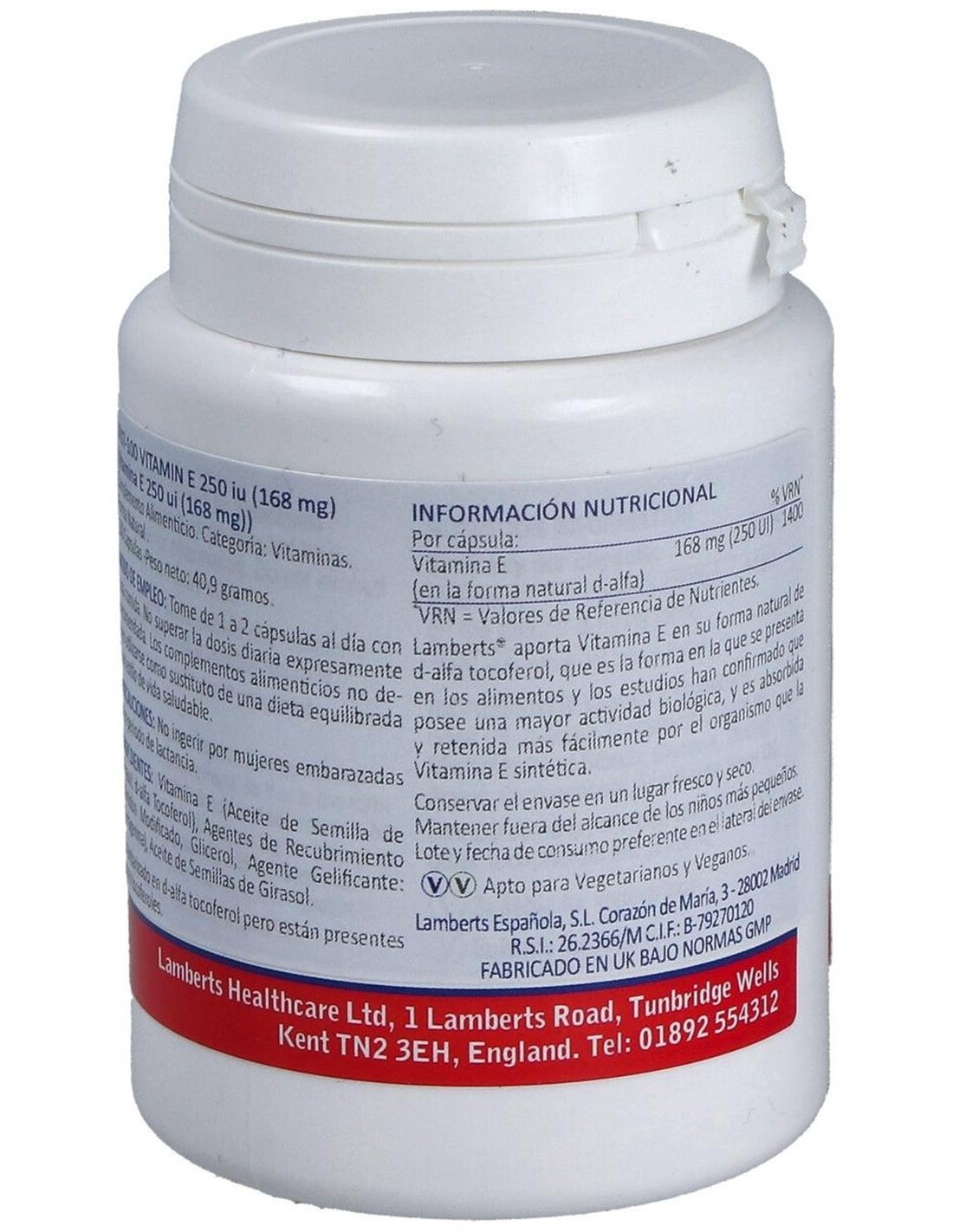 Lamberts Vitamina E es un complemento alimenticio con base de vitamina E, rica en antioxidantes, que protege las células frente al daño oxidativo producido por los radicales libres, además de contribuir al funcionamiento normal del corazón, puesto que evita que las grasas poliisaturadas se conviertan en saturadas.
