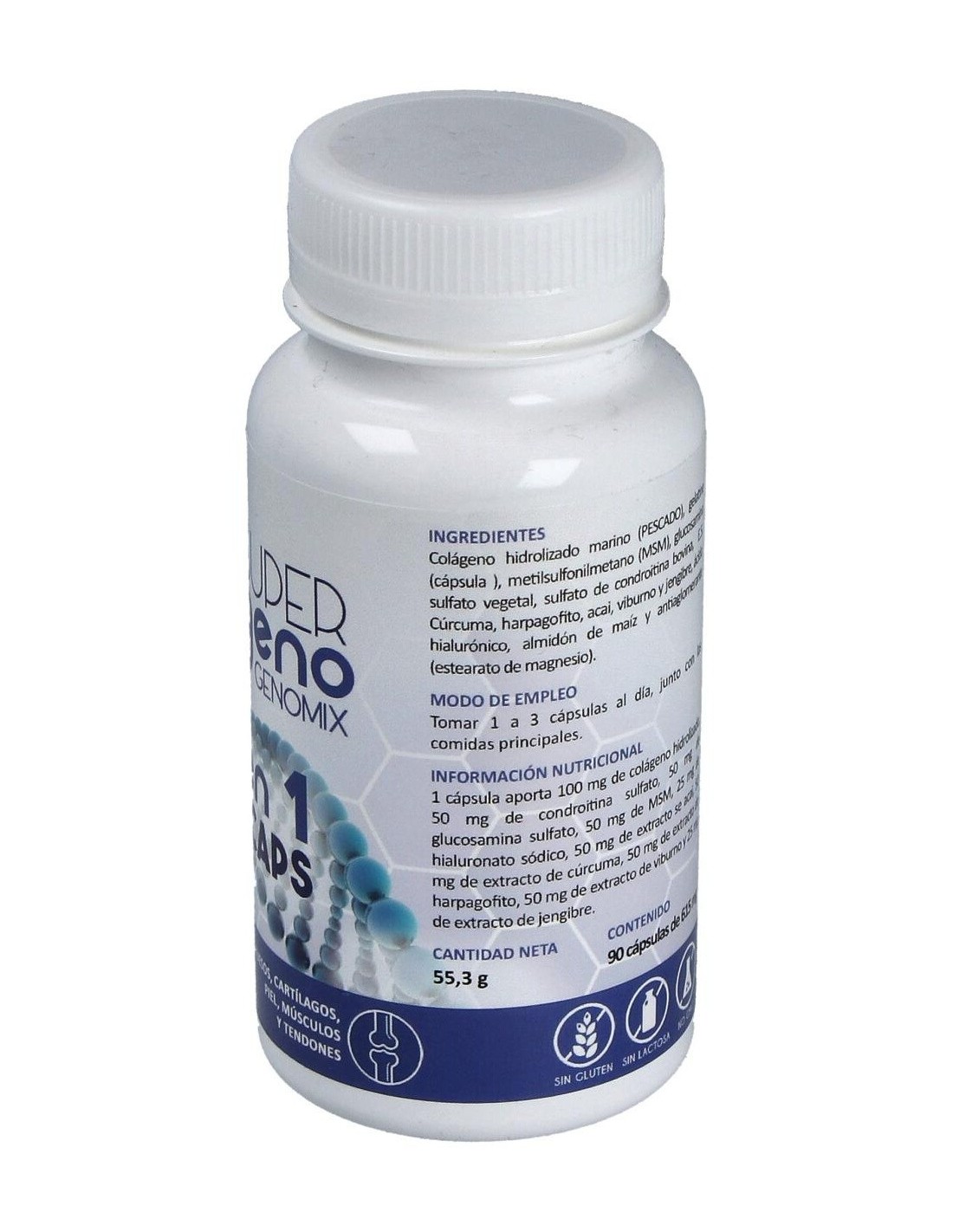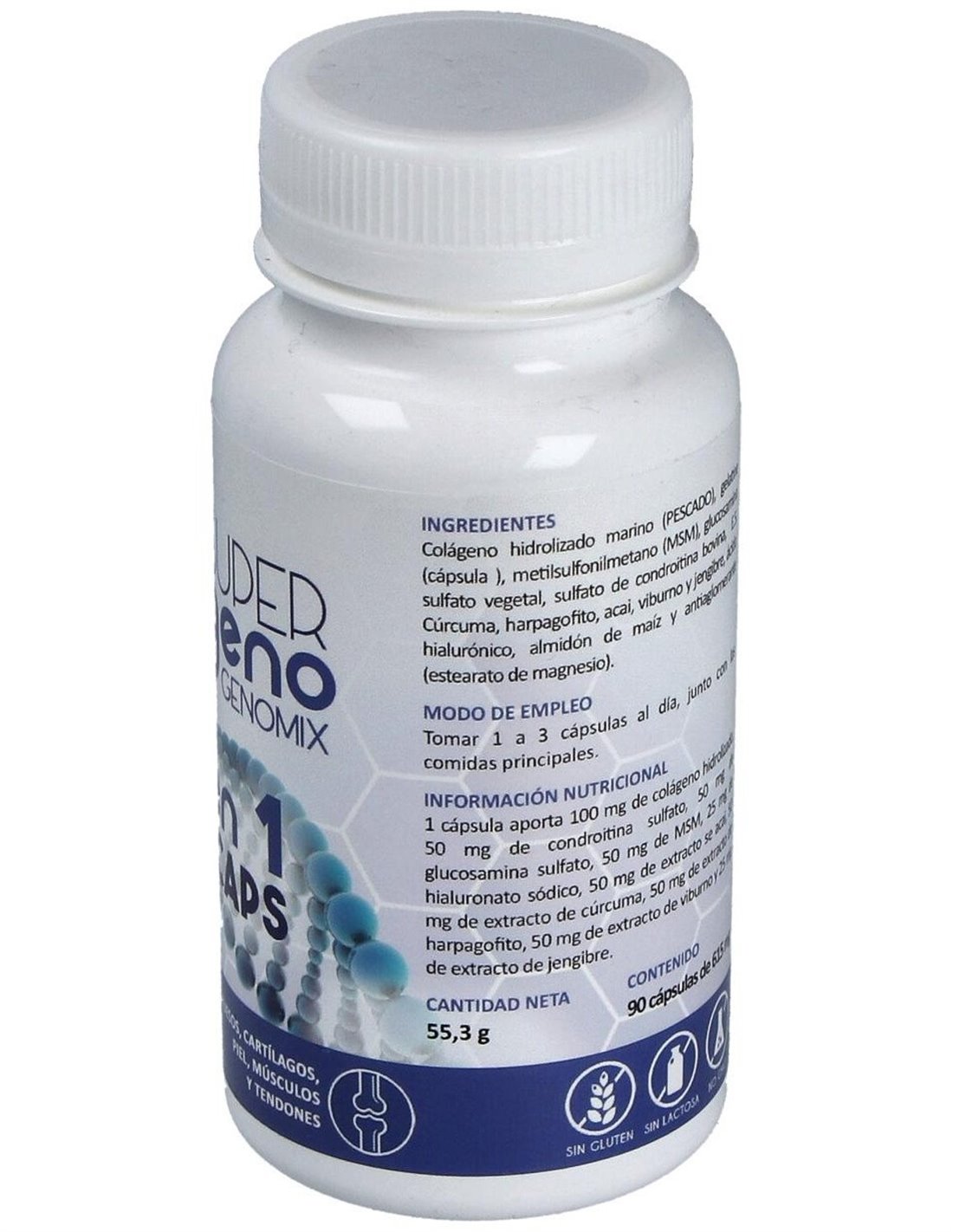 Por 1 cápsula: 100 mg de colágeno hidrolizado, 5 mg de condroitina sulfato, 50 mg de glucosamina sulfato, 50 mg de MSM, 25 mg de hialuronato sódico, 50 mg de extracto de açai, 50 mg de extracto de cúrcuma, 50 mg de extracto de harpagofito, 50 mg de extracto de viburno, 25 mg de extracto de jengibre.