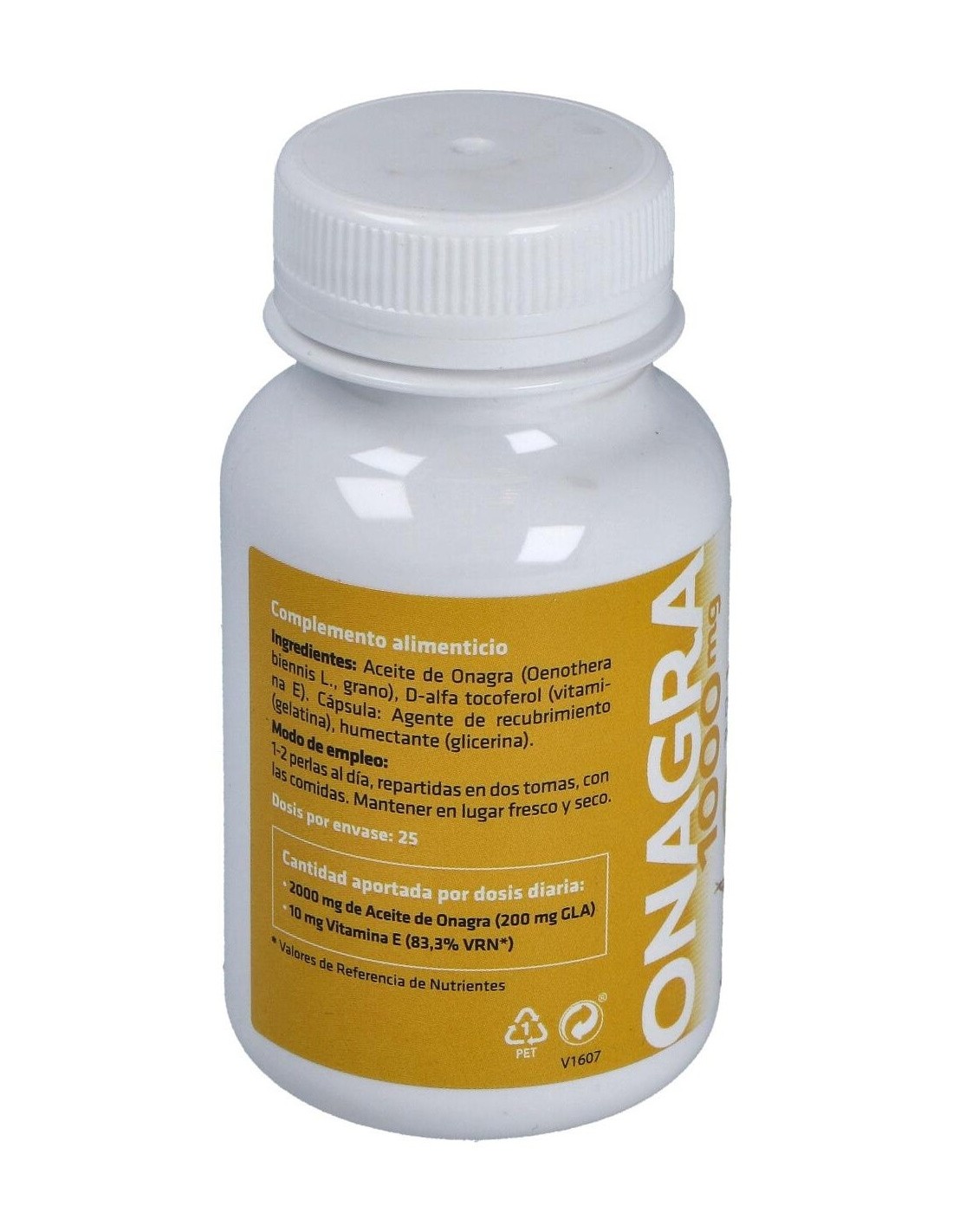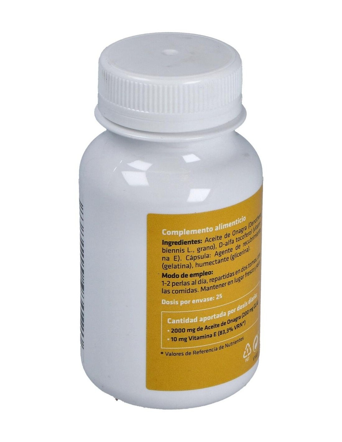 Perlas con 1000mg de aceite de onagra de primera presión en frío con min. 10% GLA, 5mg de vitamina E natural, d-alfa tocoferol acetato (50% CDR). Cobertura de gelatina y glicerina. Peso total aproximado 1390mg (incluida cobertura).
