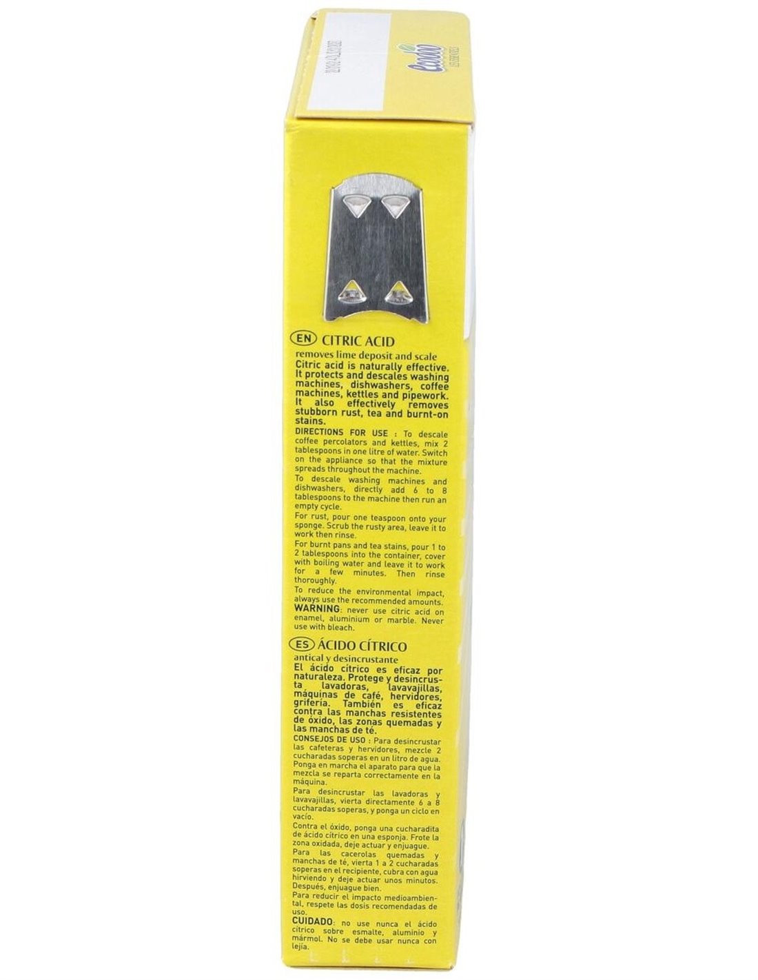 Con certificado EcoCert. Agente antical y desincrustante, con una eficacia natural, protege y desincrusta lavadoras, lavavajillas, cafeteras, hervidores y grifos. Elimina manchas de óxido, quemado y té, se presenta en un práctico formato con pico de metal.