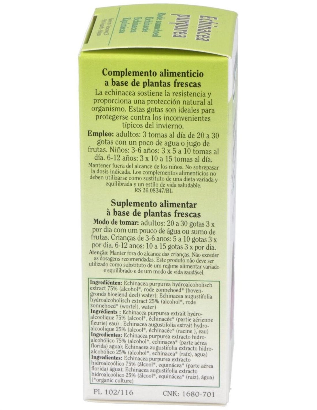 Echinacea purpurea extracto hidroalcohólico 75% (alcohol, echinacea (parte aérea florida) agua): Echinacea augustifolia extracto hidroalcohólico 25% (alcohol, echinacea (raíz), agua)