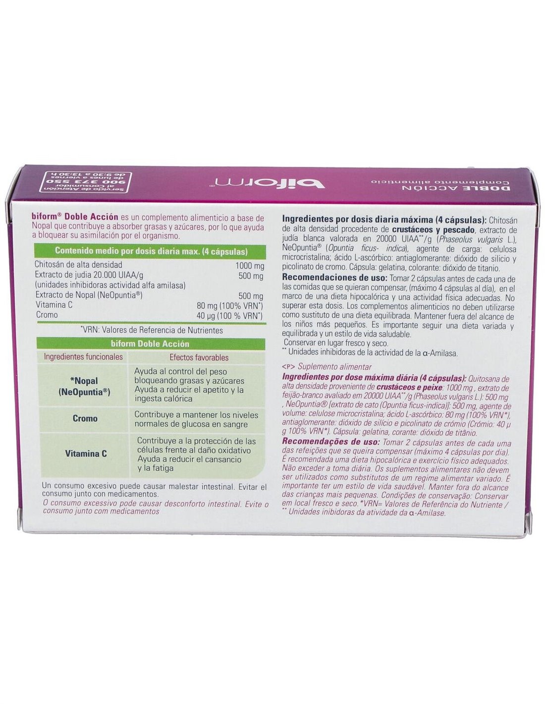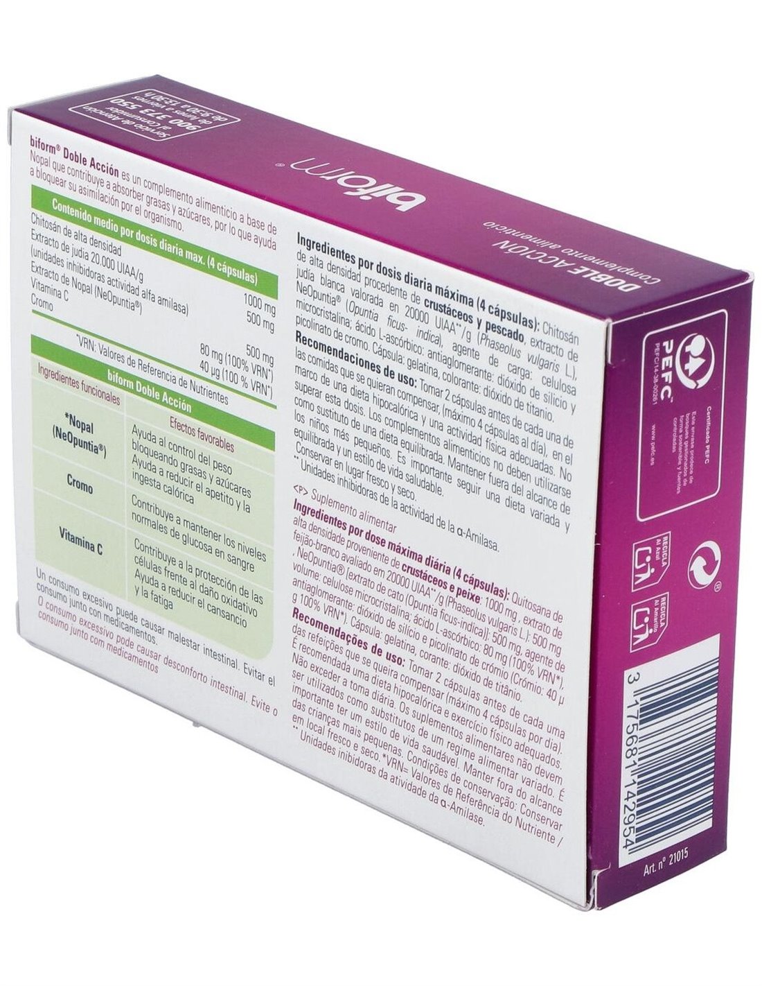 Chitosán de alta densidad procedente de crustáceos: 1000mg, extracto de judía blanca valorado en 20.000 UIAA/g (Phaseolus vulgaris L.): 500 mg, NeOpuntia® (Opuntia ficus-indica) 500mg, agente de carga: celulosa microcristalina, ácido L ascórbico: 80mg , antiaglomerante: dióxido de silicio y picolinato de cromo. (Cromo 40µg ). Cápsula: gelatina, colorante: dióxido de titanio.
