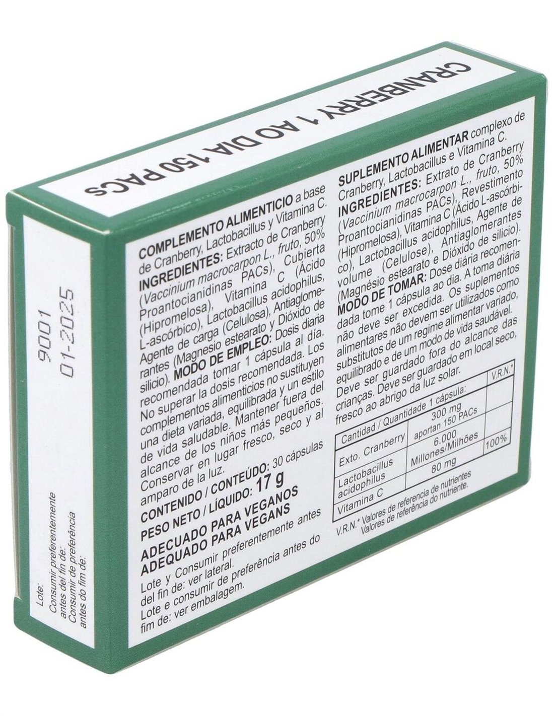 Cranberry (Vaccinium marcrocarpon), Mirtilo Rojo (50% Proantoacinidinas) 300 mg . 150 PACs, Lactobacillus Acidophilus 6000 millones, Vitamina C 80 mg.