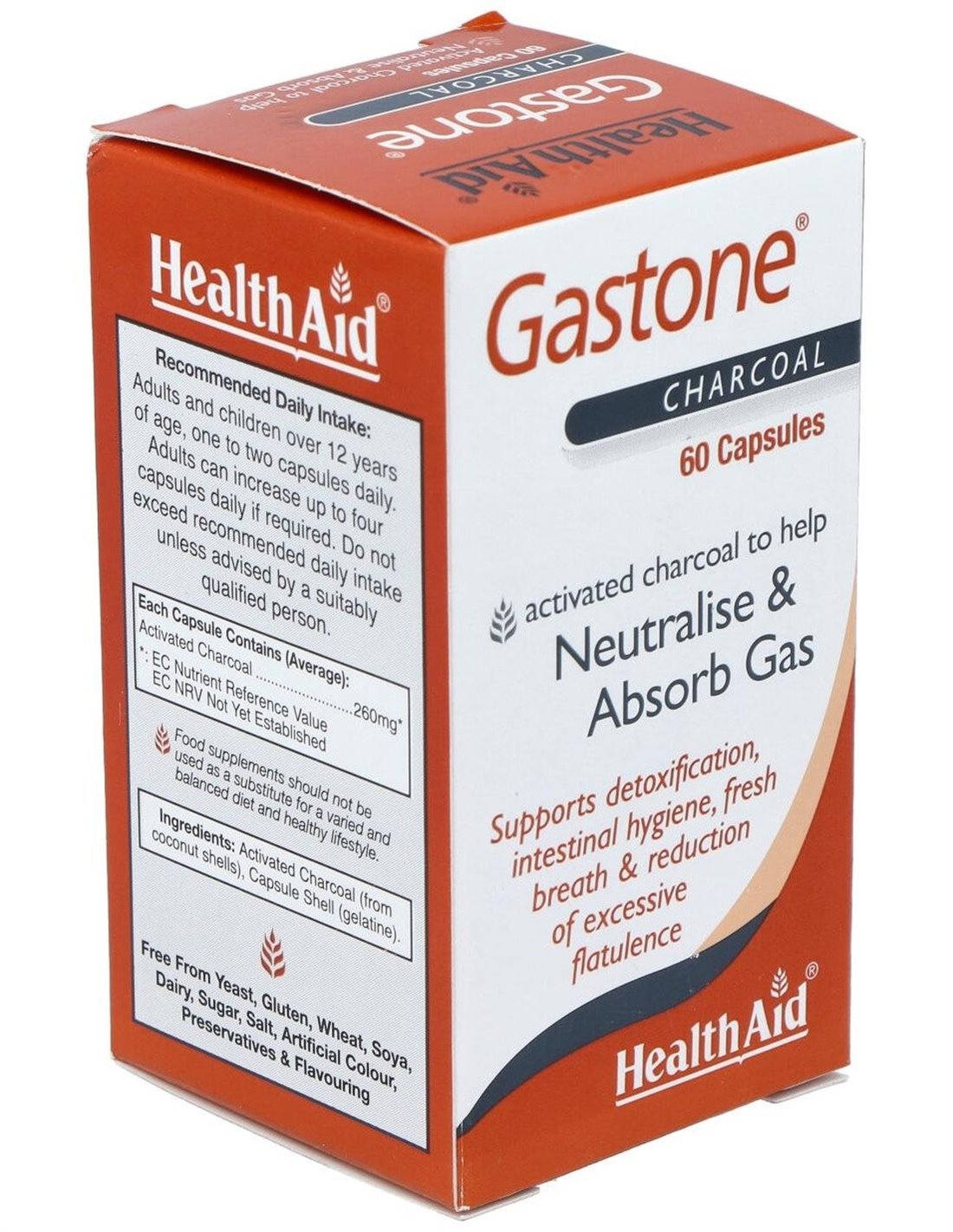 Complemento alimenticio a base de carbón activado. El carbón activo contribuye a reducir una flatulencia excesiva después de comer.