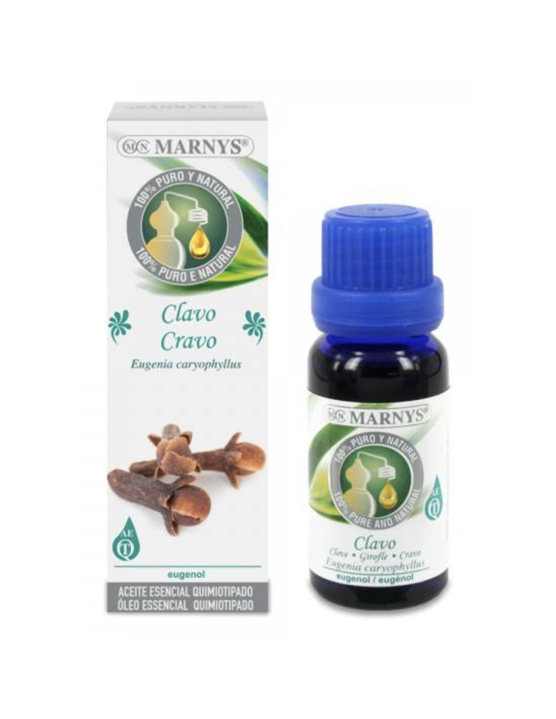 Aceite esencial de Clavo (Eugenia Caryophyllus flower oil), obtenido de la destilación de los botones florales. Quimiotipo: eugenol.