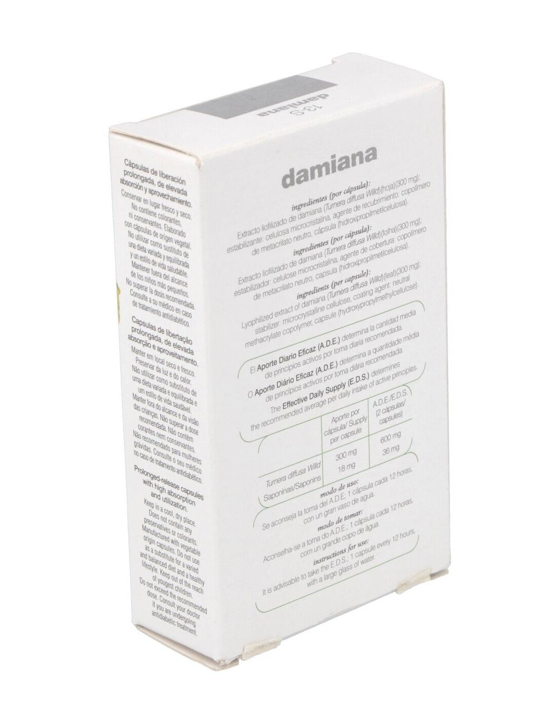 Extracto liofilizado de damiana (Turnera diffusa Willd) (hoja) (300 mg) : estabilizante: celulosa microcristalina, agente de recubrimiento: copolímero de metacrilato neutro, cápsula (hidroxipropilmetilcelulosa).