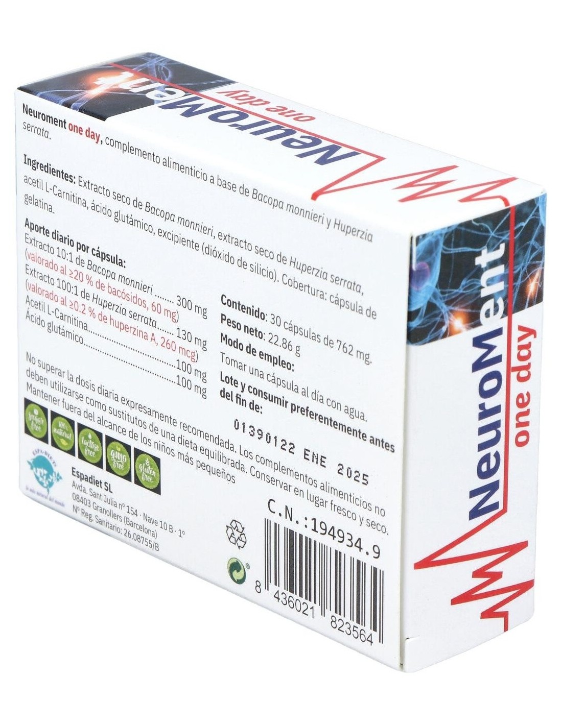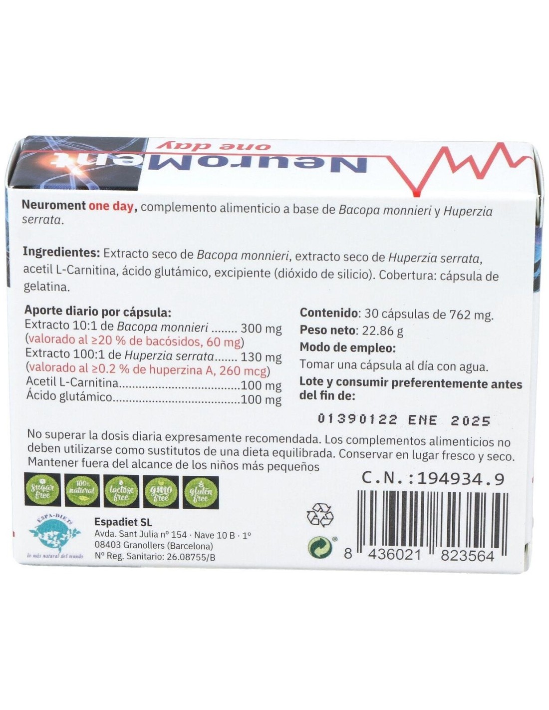 Extracto seco de Bacopa monnieri, extracto seco de Huperzia, Acetil L-Carnitina, ácido glutámico, antiaglomerante (dióxido de silicio). Cobertura: cápsula de gelatina blanca (colorante E-171)
