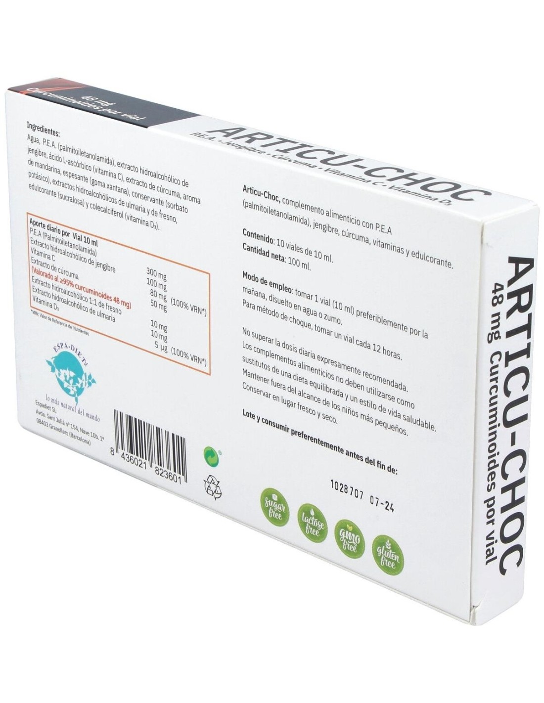 Agua, P.E.A. (palmitoiletanolamida), extracto hidroalcohólico de Jengibre, ácido L Ascórbico (Vitamina C), extracto de Cúrcuma, aroma de Mandarina, espesante (goma xantana), conservante (sorbato potásico), extractos hidroalcohólicos de Ulmaria y de Fresno, edulcorante (sucralosa) y colecalciferol (Vitamina D3).