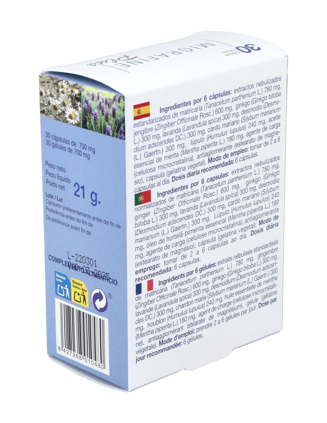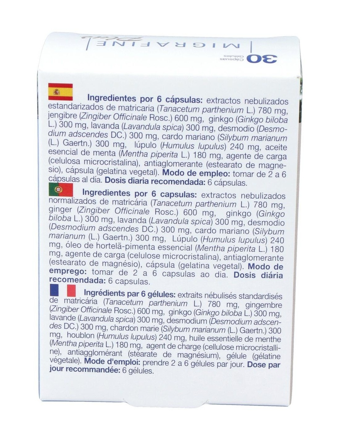 Ingredientes por 6 cápsulas: extractos nebulizados estandarizados de matricaria (Tanacetum parthenium L.) 780 mg, jengibre (Zingiber Officinale Rosc.) 600 mg, ginkgo (Ginkgo biloba L.) 300 mg, lavanda (Lavandula spica) 300 mg, desmodio (Desmodium adscendes DC.) 300 mg, cardo mariano (Silybum marianum (L.) Gaertn.) 300 mg, lúpulo (Humulus lupulus) 240 mg, aceite esencial de menta (Mentha piperita L.) 180 mg, agente de carga (celulosa microcristalina), antiaglomerante (estearato de magnesio), cápsula (gelatina vegetal).