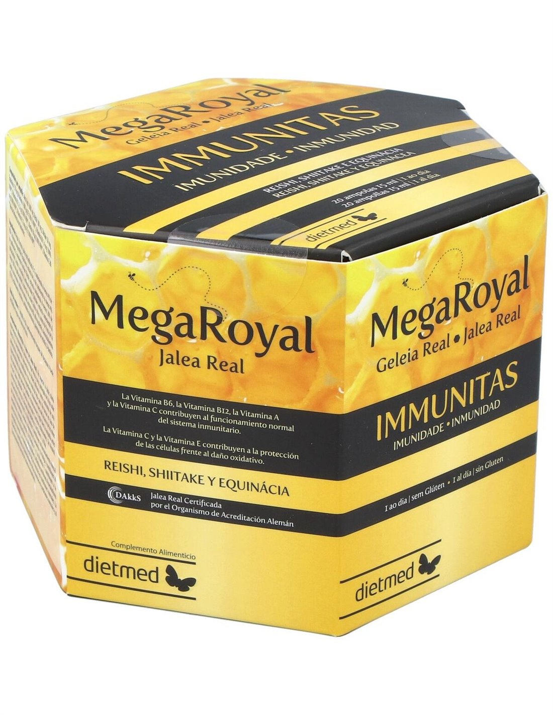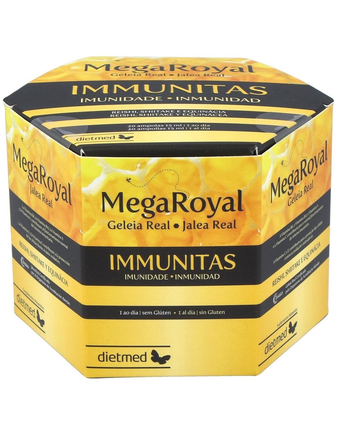 Jalea Real 2000 mg, Reishi 100 mg, Shiitake 50 mg, Equinácia 150 mg, Vitamina A 800 µg RE (100% VRN*), Vitamina B6 1,4 mg (100% VRN*), Vitamina B12 2,5 µg (100% VRN*), Biotina 50 µg (100% VRN*), Vitamina C 80 mg (100% VRN*), Vitamina E 12 mg a-TE (100% VRN*)