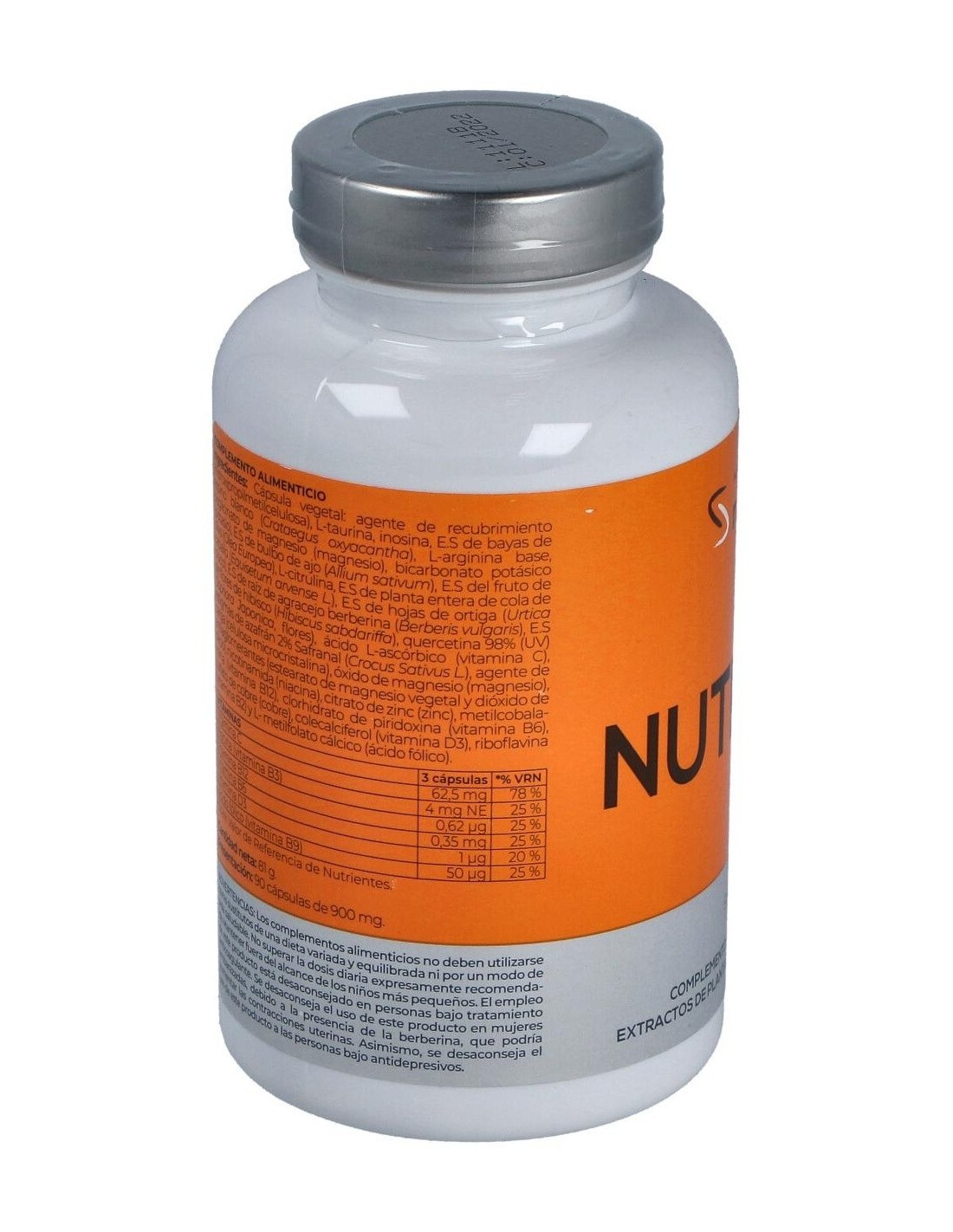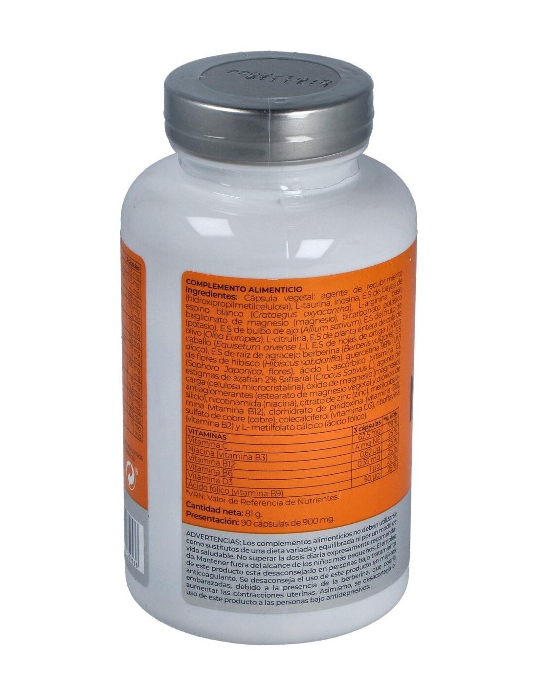 Cápsula vegetal: agente de recubrimiento (hidroxipropilmetilcelulosa), L-taurina, inosina, ext. seco de bayas de espino blanco (Crataegus oxyacantha), L-arginina base, bisglicinato de magnesio (magnesio), bicarbonato potásico (potasio), ext. seco de bulbo de ajo (Allium sativum), ext. seco del fruto de olivo (Olea Europea), L citrulina, ext. seco de planta entera de cola de caballo (Equisetum arvense L.), ext. seco de hojas de ortiga (Urtica dioca), ext. seco de raíz de agracejo berberina (Berberis vulgaris), ext. seco de flores de hibisco (Hibiscus sabdariffa), quercetina 98 % (UV) (Sophora Japonica, flores), ácido L-ascórbicom (vitamina C), estigmas de azafrán 2 % Safranal (Crocus Sativus L.), agente de carga (celulosa microcristalina), óxido de magnesio (magnesio), antiaglomerantes (estearato de magnesio vegetal y dióxido de silicio), nicotinamida (niacina), citrato de zinc (zinc), metilcobalamina (vitamina B12), clorhidrato de piridoxina (vitamina B6), sulfato de cobre (cobre), colecalciferol (vitamina D3), riboflavina (vitamina B2) y L-metilfolato cálcico (ácido fólico).