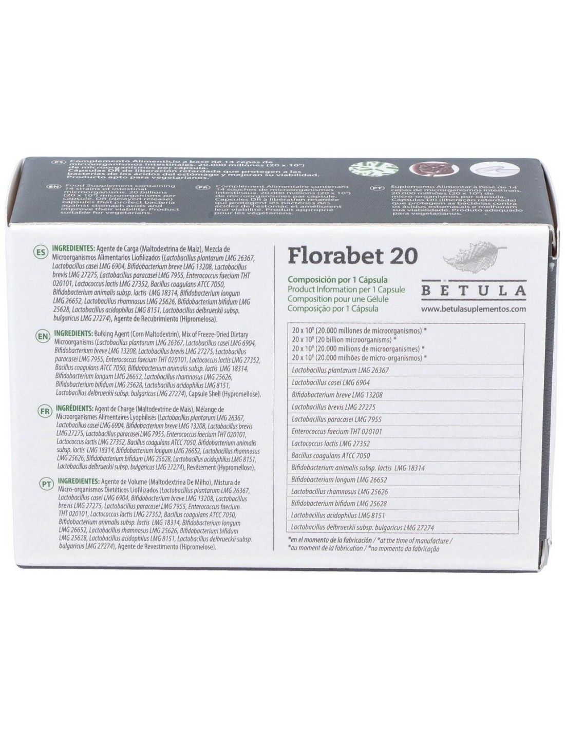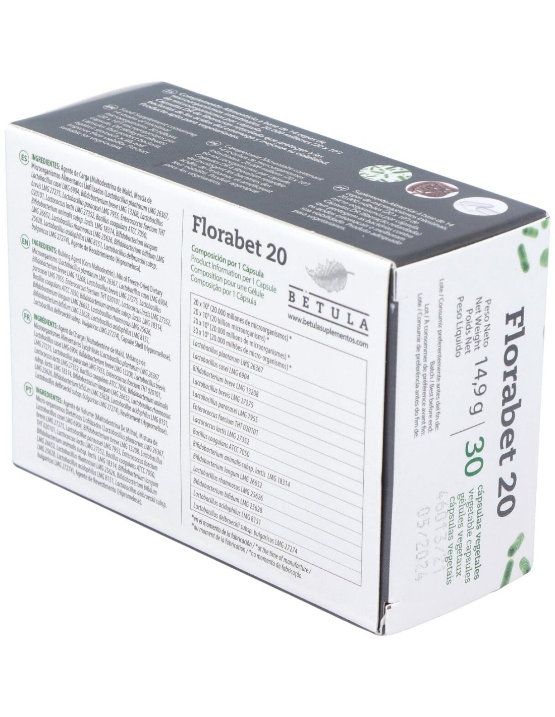 Agente de Carga (Maltodextrina de Maíz), Mezcla de Microorganismos Alimentarios Liofilizados (Lactobacillus plantarum LMG 26367, Lactobacillus casei LMG 6904, Bifidobacterium breve LMG 13208, Lactobacillus brevis LMG 27275, Lactobacillus paracasei LMG 7955, Enterococcus faecium THT 020101, Lactococcus lactis LMG 27352, Bacillus coagulans ATCC 7050, Bifidobacterium animalis ssp lactis LMG 18314, Bifidobacterium longum LMG 26652, Lactobacillus rhamnosus LMG 25626, Bifidobacterium bifidum LMG 25628, Lactobacillus acidophilus LMG 8151, Lactobacillus delbr bulgaricus LMG 27274), Agente de Recubrimiento (Hipromelosa).