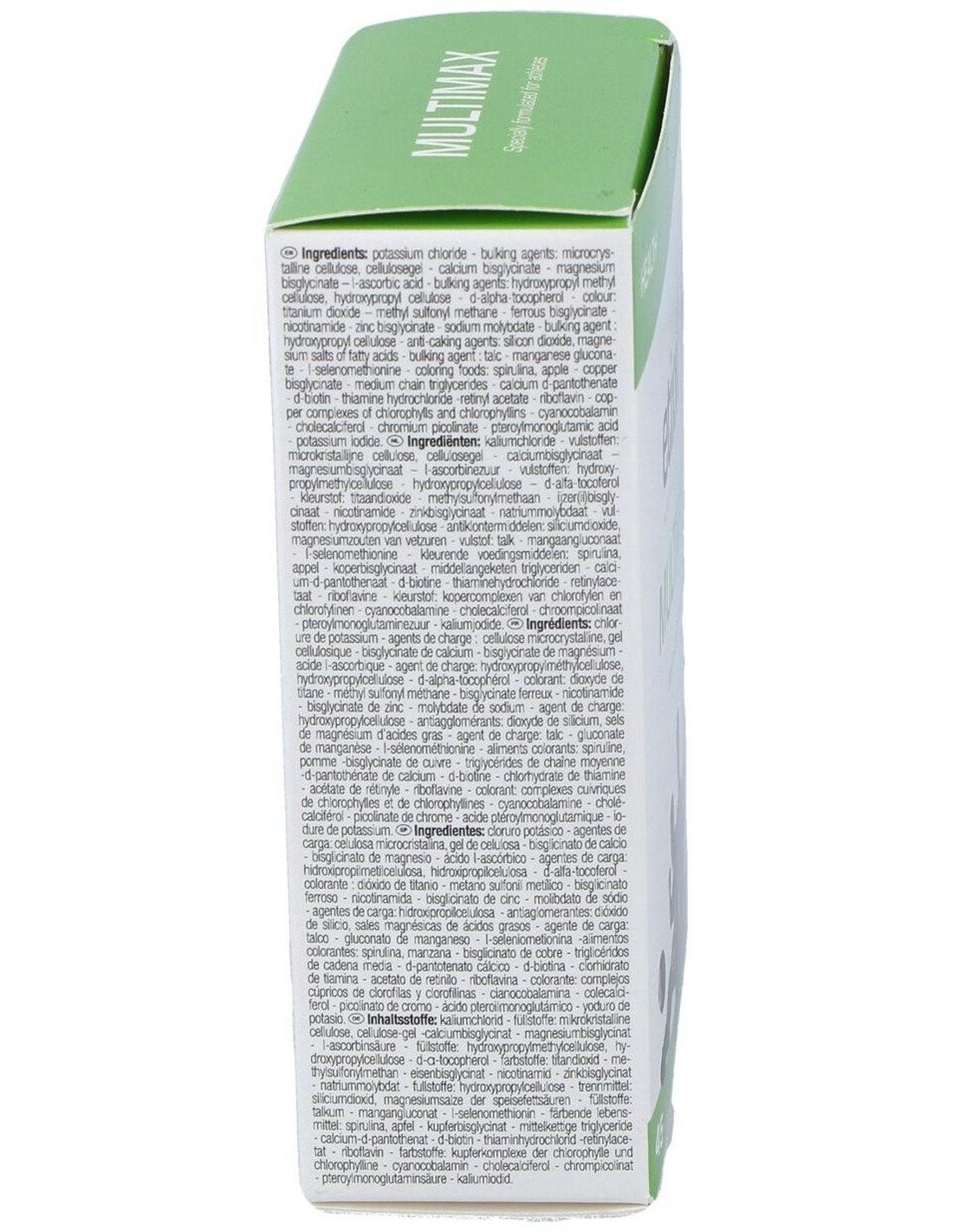 Cloruro potásico - agente de carga: celulosa - bisglicinato de calcio - bisglicinato de magnesio - agentes decarga: fosfato de calcio y maltodextrina - ácido L-ascórbico - D-alfa-tocoferol - extracto seco de Fucus vesiculosus con yodo - metilsulfonilmetano - bisglicinato de hierro - bisglicinato de zinc - nicotinamida - molibdato de sodio - antiaglomerantes: dióxido de silicio, estearato de magnesio y talco - agente de recubrimiento: goma laca - agentes de carga: hidroxipropilmetil celulosa y polidextrosa - colorante: dióxido de titanio - L-selenio metionina - bisglicinato de manganeso - bisglicinato de cobre - D-pantotenato de calcio - D-biotina - retinol - riboflavina - clorhidrato de tiamina - cianocobalamina - colecalciferol - picolinato de cromo - colorante: complejo cuprico de clorofila - ácido fólico - aceite fraccionado de coco -colorante: indigotina.