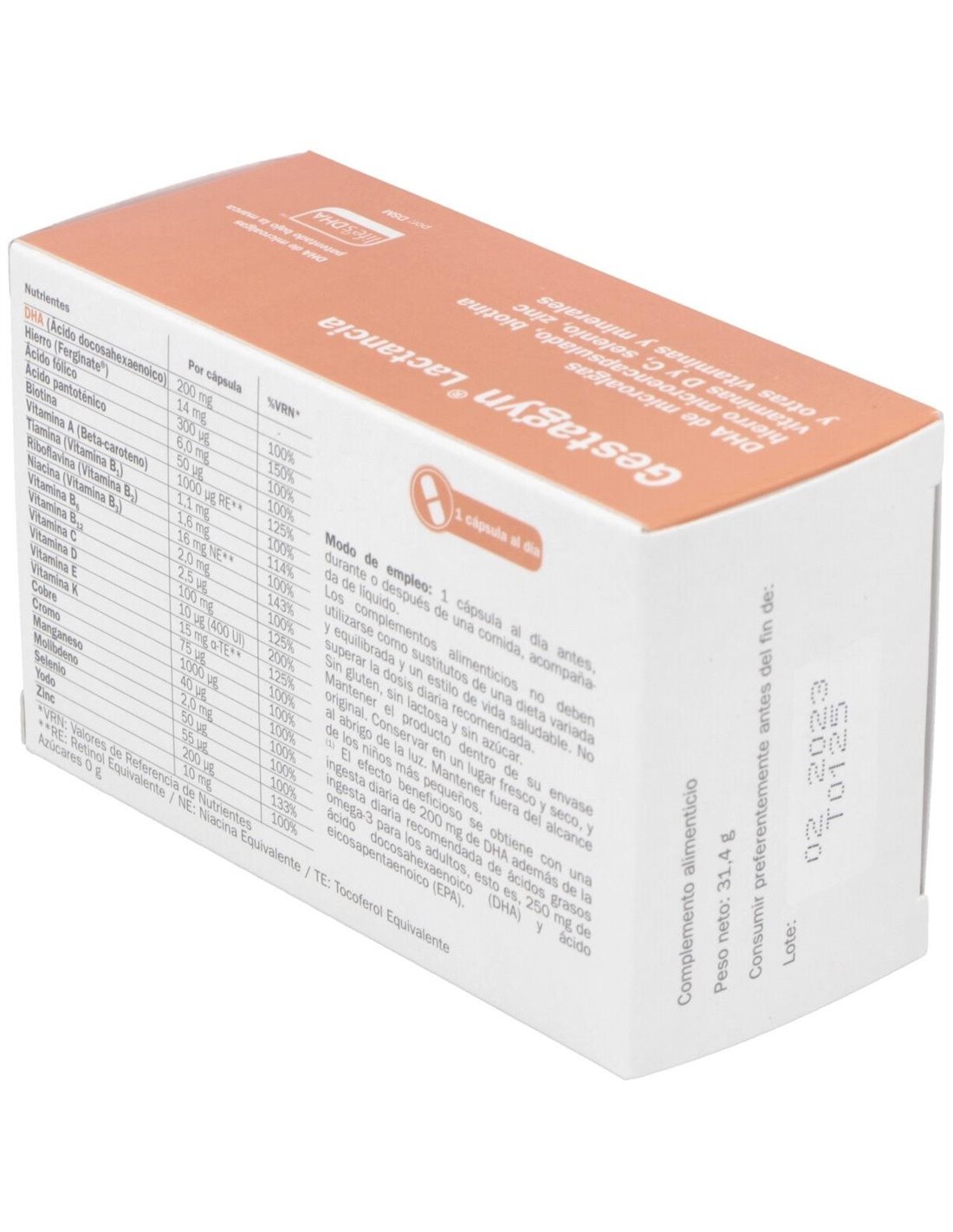 Complemento alimenticio específico para la lactancia con DHA de microalgas, ácido fólico, yodo, betacaroteno, y otras vitaminas y minerales adecuados para la etapa de la lactancia.