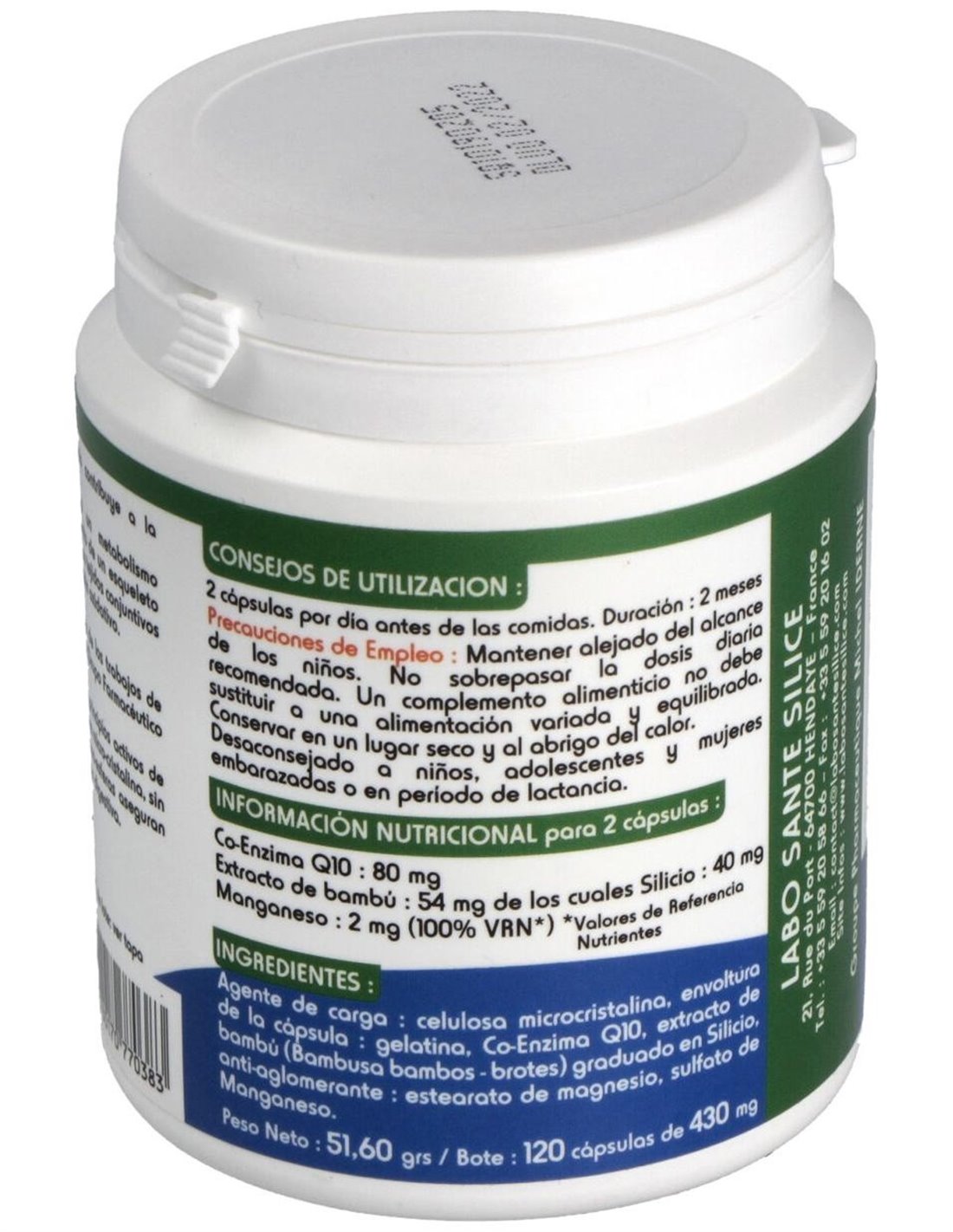 Agente de carga : celulosa microcristalina, envoltura de la cápsula : gelatina, Co Enzima Q10, extracto de bambú (Bambusa bambos - brotes) graduado en Silicio, anti-aglomerante : estearato de magnesio, sulfato de Manganeso.