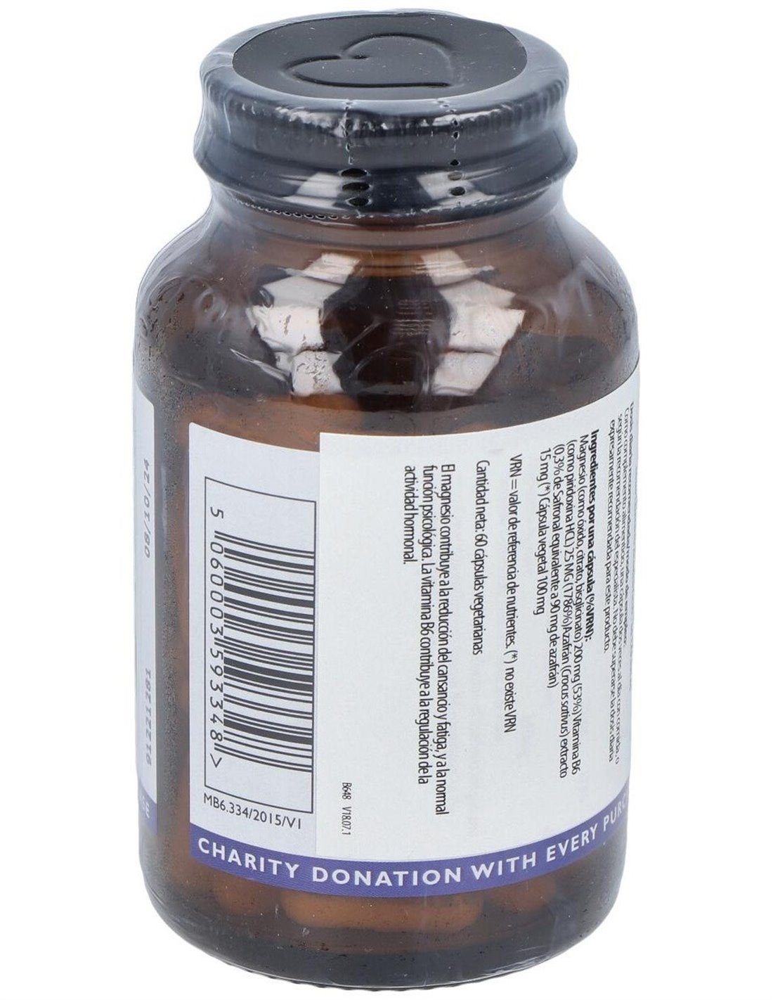 El magnesio contribuye a la reducción del cansancio y fatiga, y a la normal función psicológica. La vitamina B6 contribuye a la regulación de la actividad hormonal. Apto para veganos. No testado en animales.